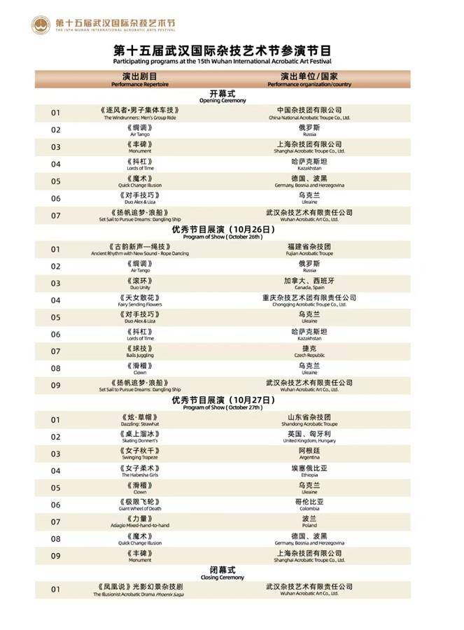 五大洲群英再聚首,杂技之美绽放英雄城。来自中国、俄罗斯、德国、哈萨克斯坦、埃塞俄比亚、匈牙利等15个国家的18个顶尖杂技、魔术、滑稽等节目将汇聚一堂,高空节目、地上节目、魔术、滑稽等国际杂技艺术四大门类,均将在此次展演中亮相。本届杂技艺术节将实行阶梯惠民票价,其中100元及以下低价票占比八成。目前开幕式和周末两天(10月26日、27日)门票均已售罄。