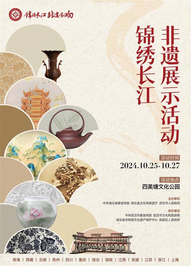 作为长江文化艺术季的活动之一,“锦绣长江”非遗展示的主会场设在四美塘文化公园,展馆总面积约一万平方米。展示活动精心选取了长江干流流域和长江经济带区域13个省区市的210个非遗代表性项目,汇聚了360多名非遗代表性传承人,展品总数超万件。现场还将邀请表演类非遗项目,让观众直观感受到长江流域沿线风格各异、特色鲜明的传统文化。