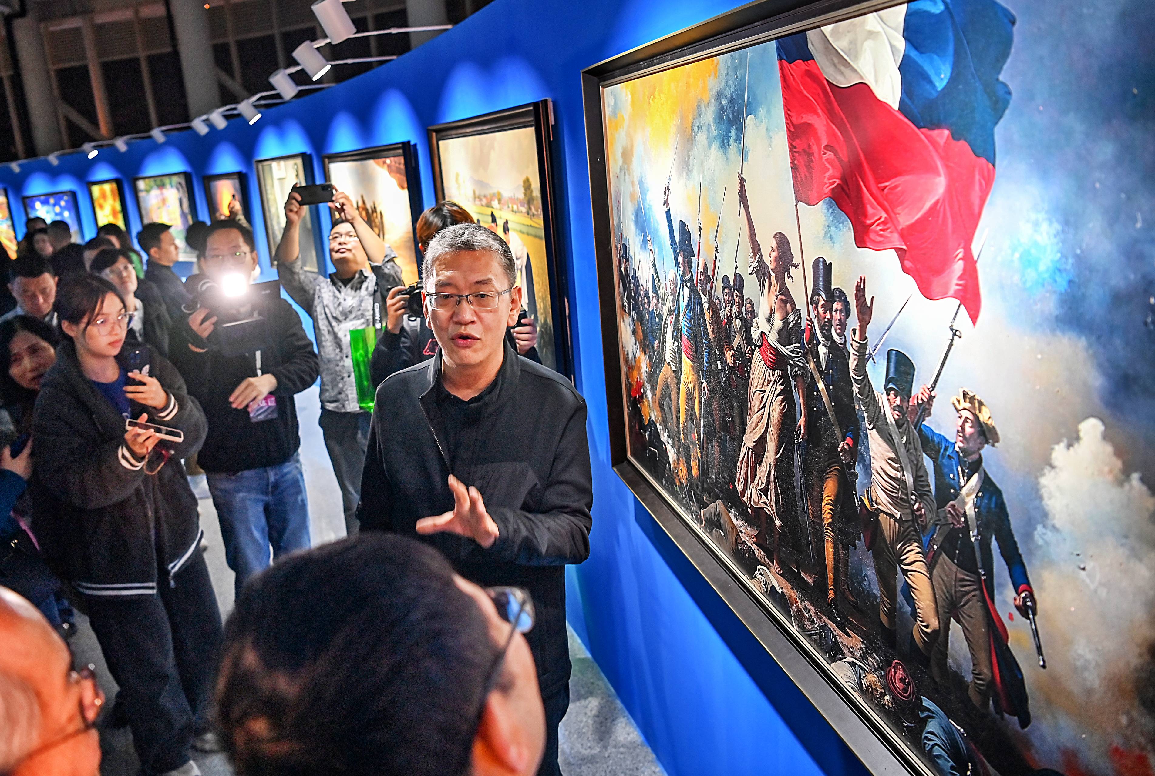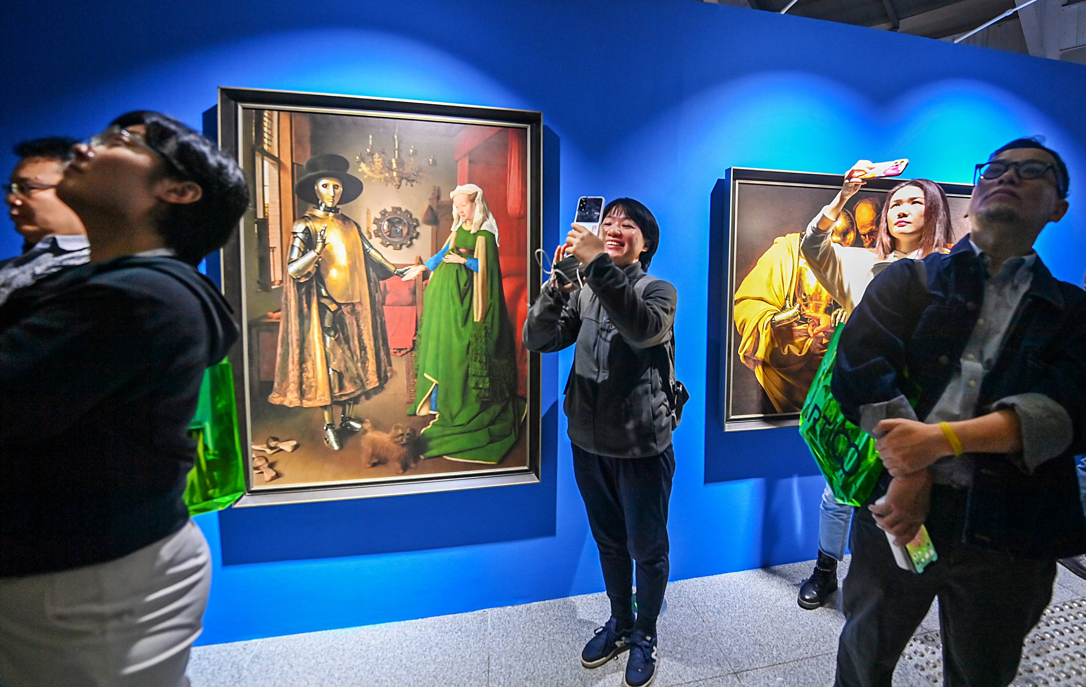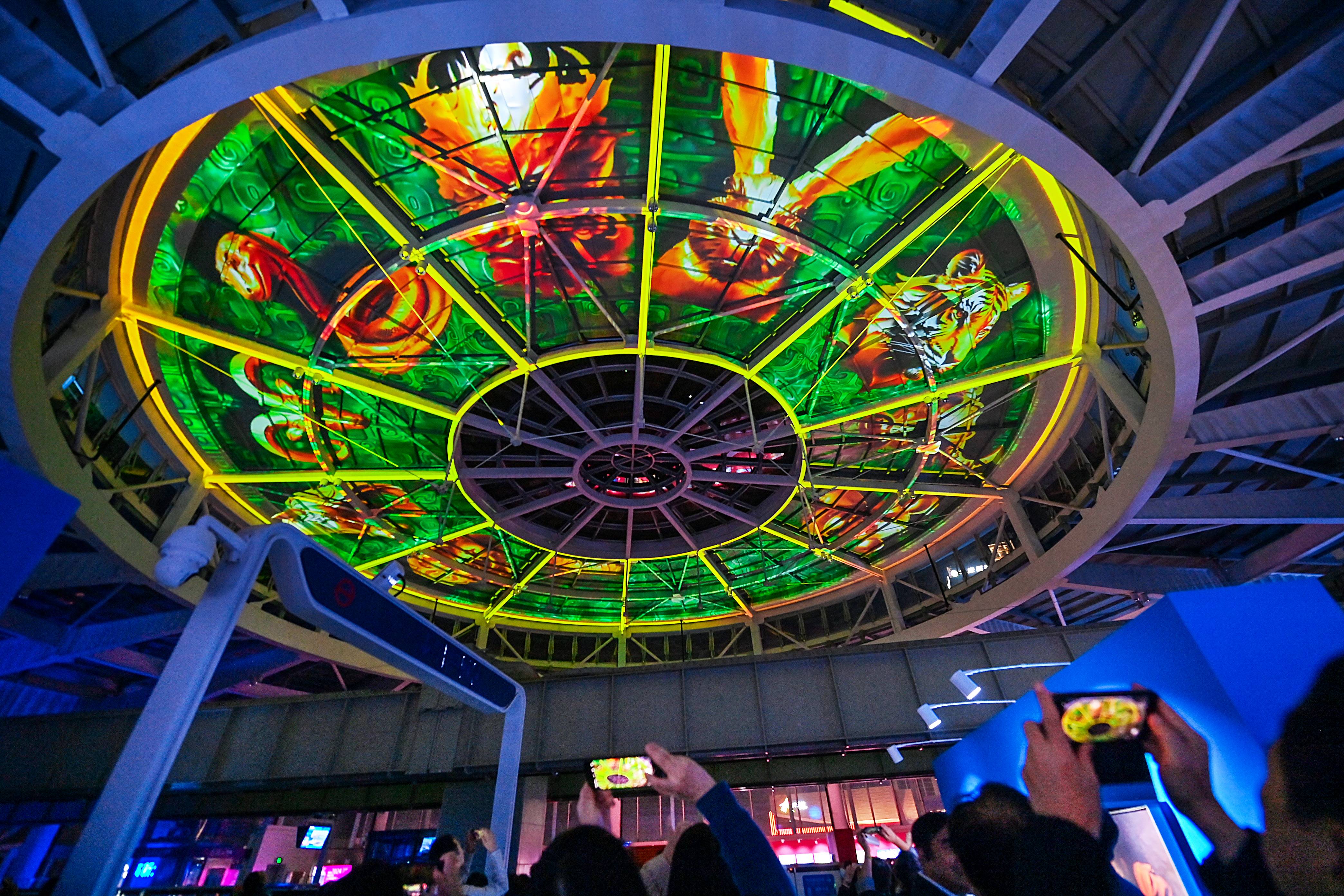 高新大道站是本次展览的主展区,展示了人工智能在艺术创作中的创新实践。站台上展出《失真的世界》专题作品,AI“脑补”了35件世界名画。6台高清投影设备不着痕迹地将绚烂的光线打在穹顶上,时而迸发出多彩的烟花,时而宛如梦幻的万花筒,嘉宾们在无需佩戴任何辅助设备的情况下,享受AIGC创造的360度全方位的立体影像。(湖北日报全媒记者 朱熙勇 通讯员 张璨龙 摄)