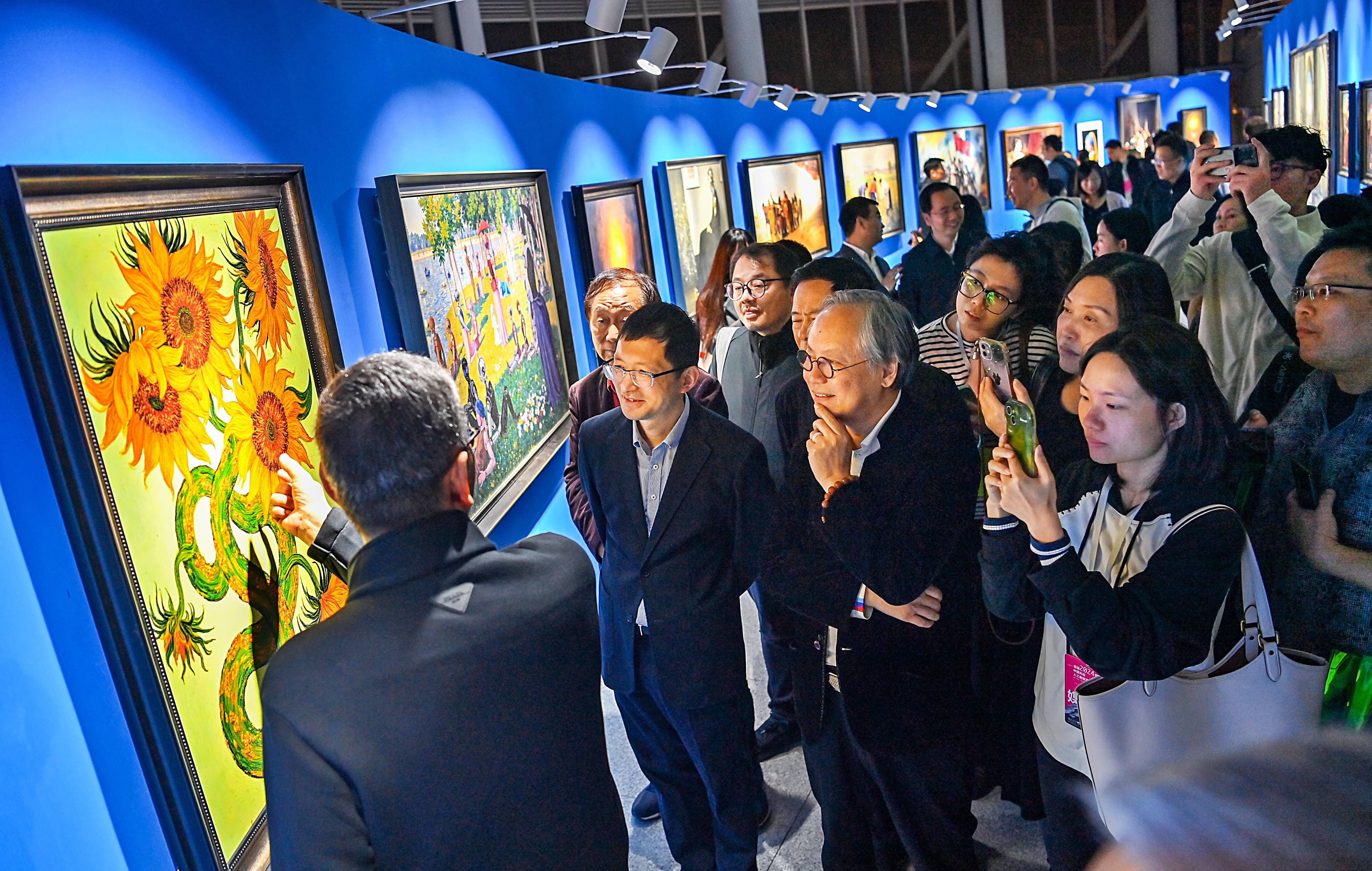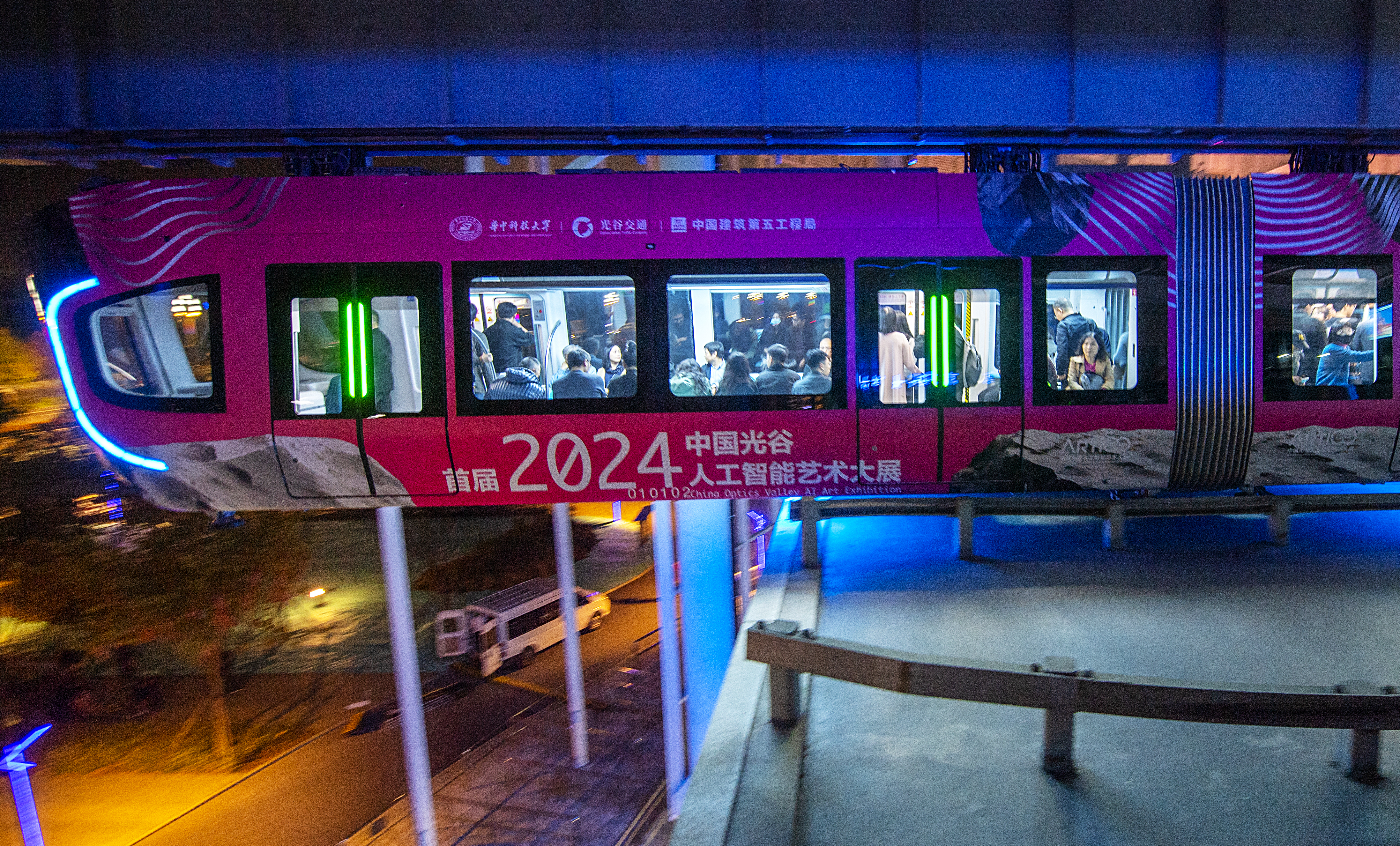 10月25日晚,中国光谷人工智能艺术大展在武汉光谷空轨沿线的4个站台开幕,吸引了众多艺术爱好者与科技前沿人士的关注。展览将AI艺术引入社会公共空间,带来了全新的视觉体验,打造一个集创新与公共艺术于一体的空中艺术馆。展区依托光谷空轨进行,是一次艺术与公共空间的结合,长度5.4公里,展品近300件,涵盖雕塑、VR互动装置、影像等领域的前沿应用。