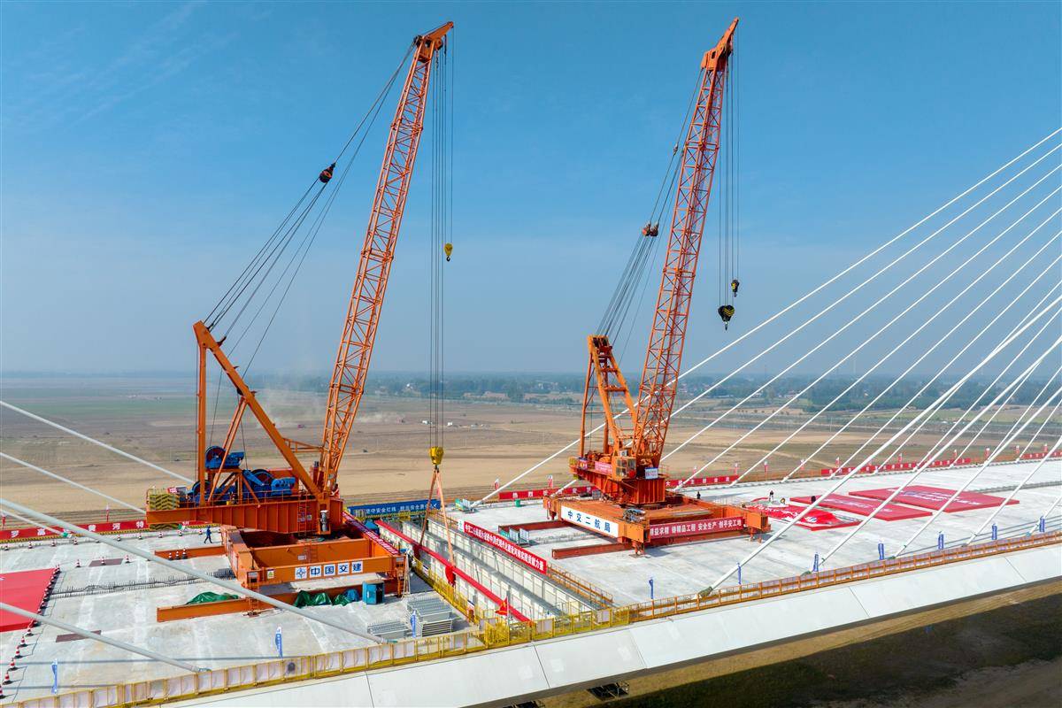 安罗高速黄河特大桥全长15.223公里,是黄河上最长的公路桥梁。其中,主桥长1010米,为双塔双索面组合梁斜拉桥,主塔高182米、主跨520米、桥宽51.5米。其斜拉索施工精度达千分位级,主梁施工实现相邻段高差、主梁轴线偏位、高程误差均为毫米级的高精度合龙。