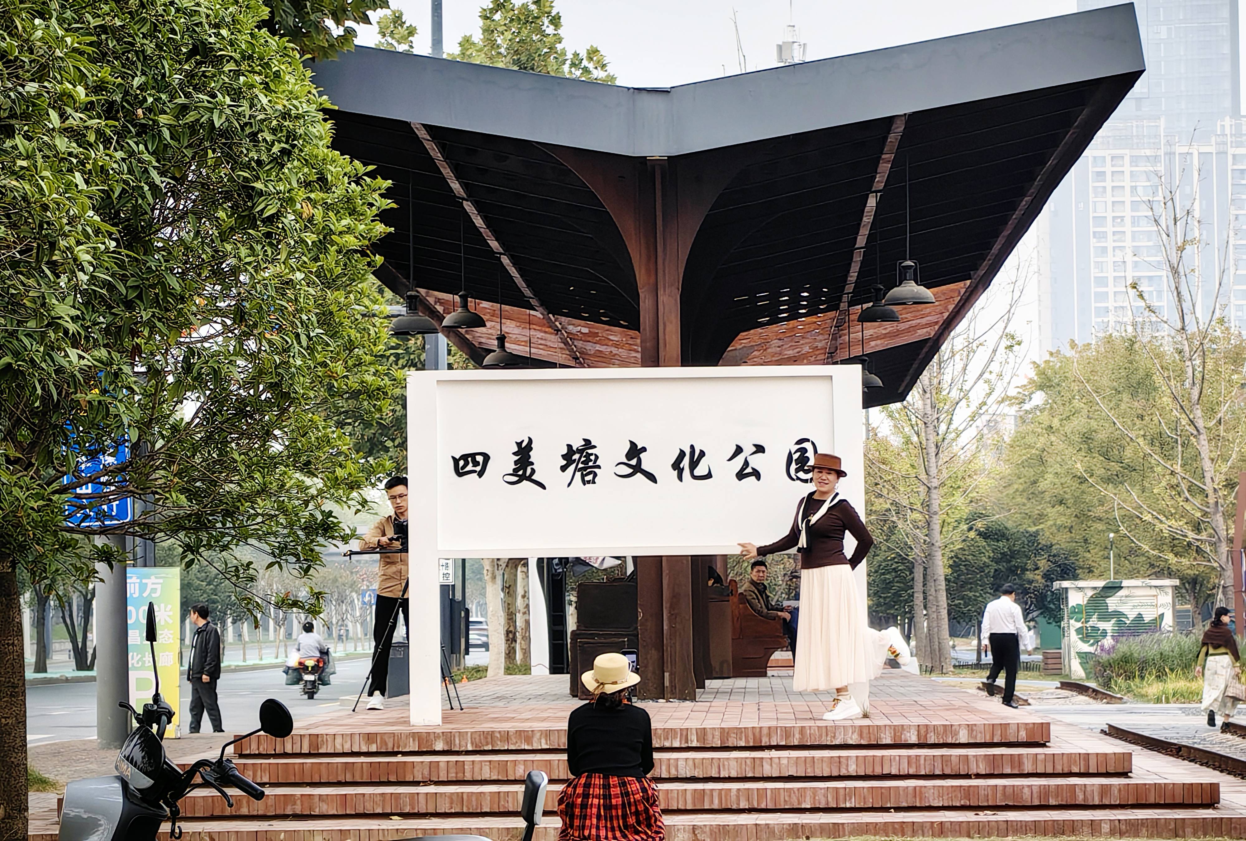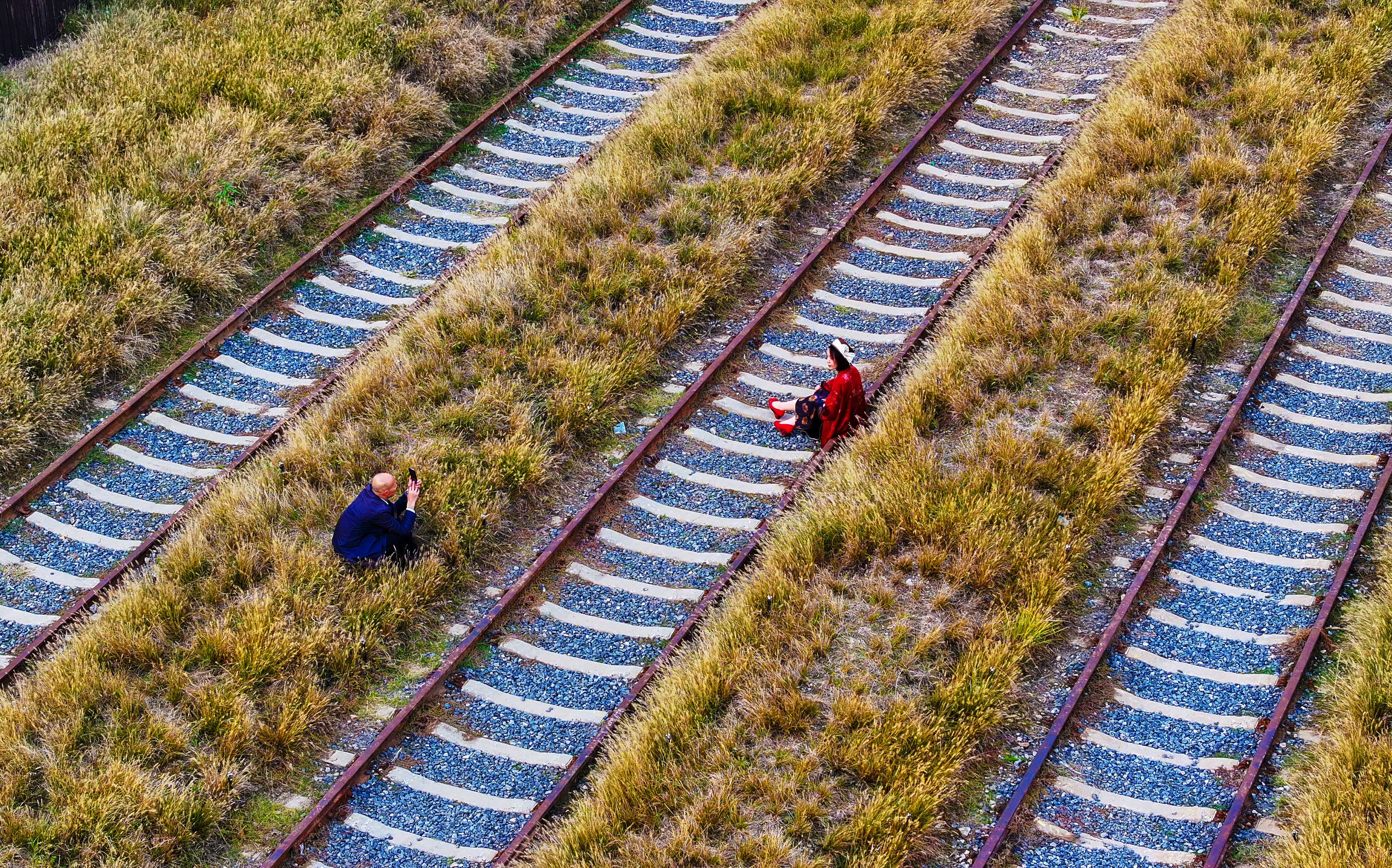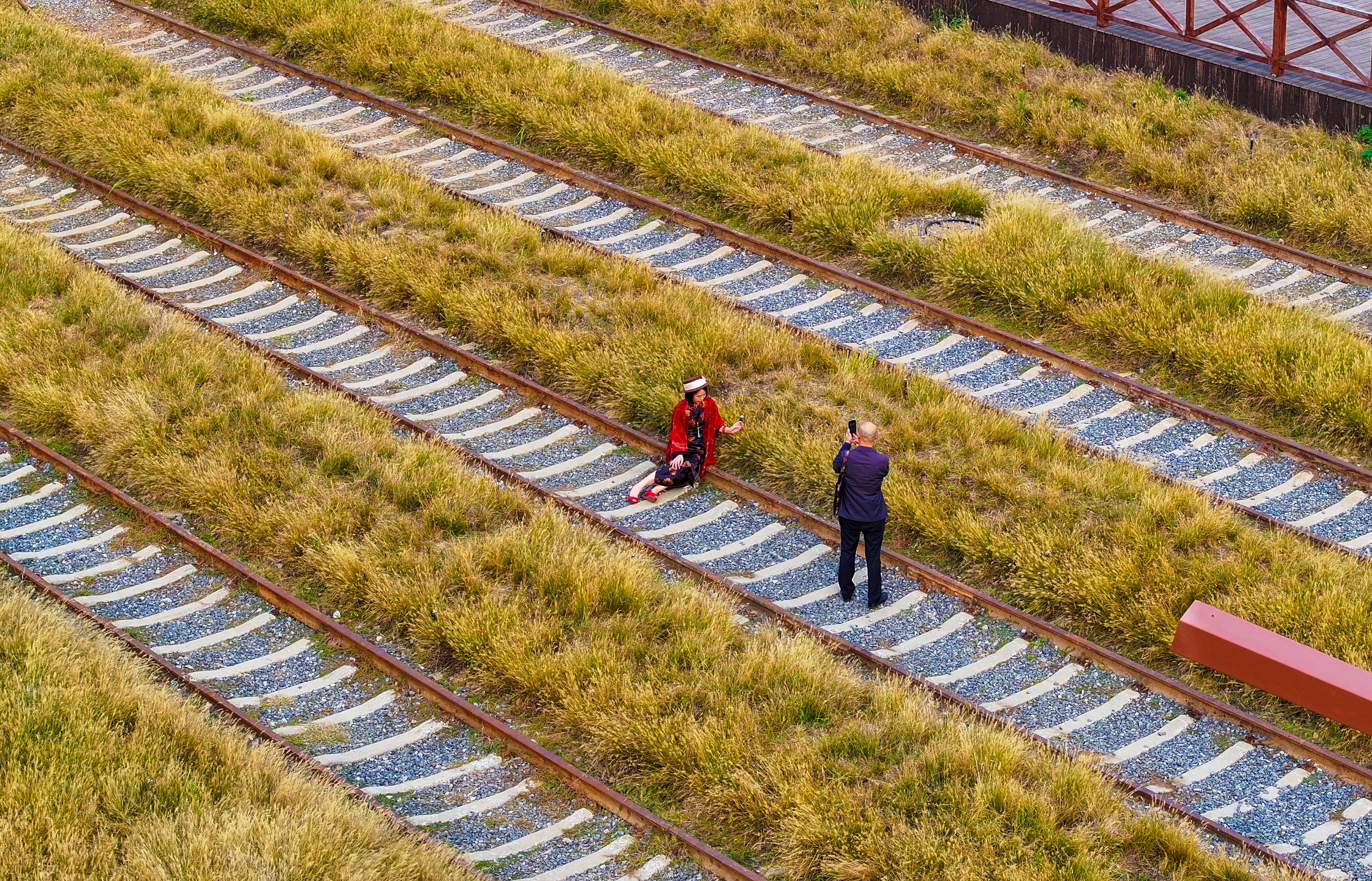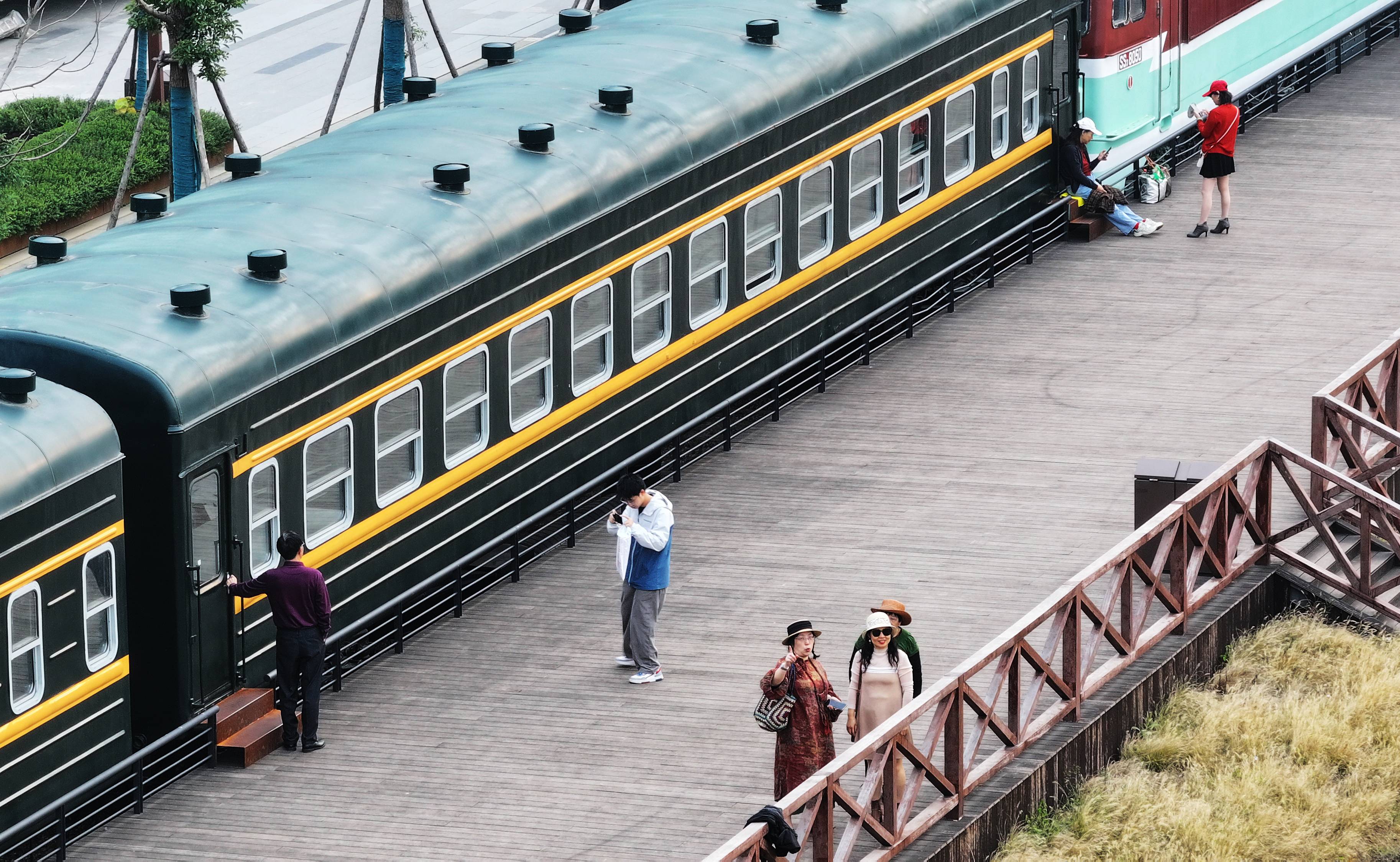 10月28日,游客在武汉市武昌四美塘文化公园留影。该公园是2023年新开放的网红公园,但它已有100多岁——1900年动工的粤汉铁路终点站,便是今天四美塘文化公园所在的地方——1917年建成的徐家棚站。经过改建,这里已是武汉江边最出片的打卡点之一:当秋天的空气里满是桂花的香气,走在松软的草海,曾经的武九铁路轨道,一节节绿皮火车错落其间,红砖厂房在秋日的阳光下更显沧桑,令人流连忘返。(湖北日报全媒记者田悦 摄)