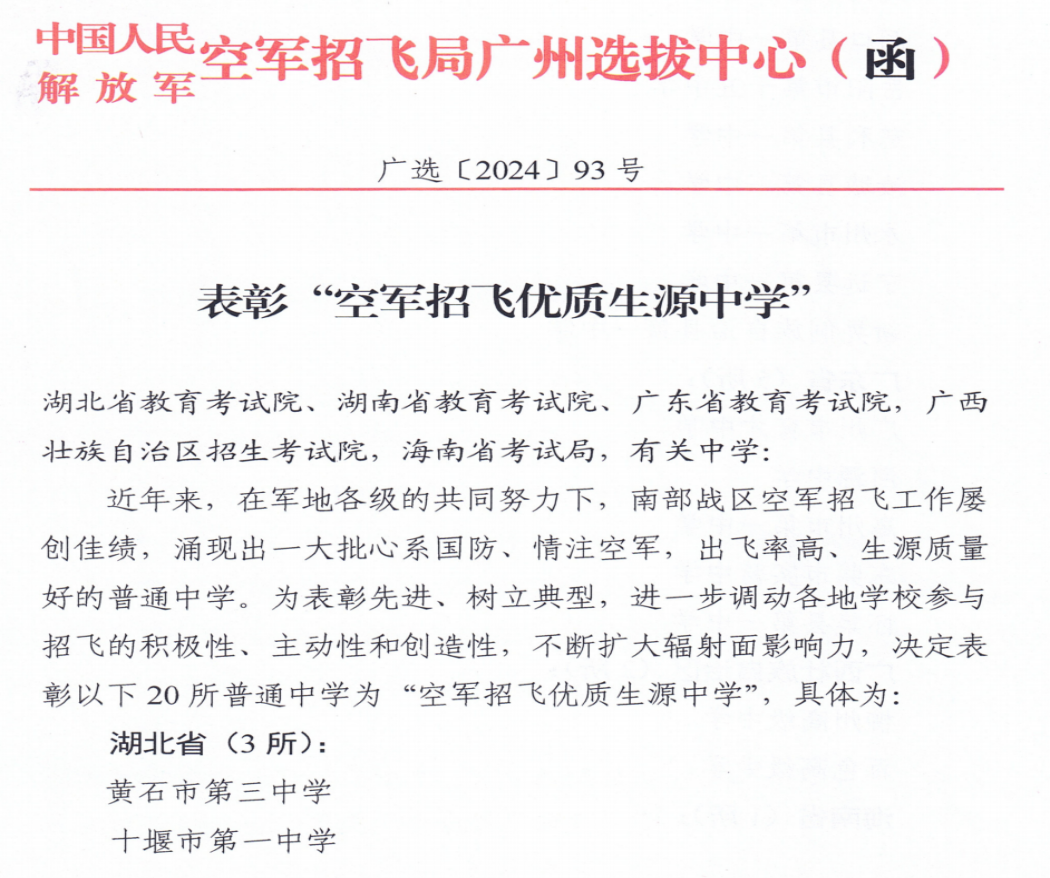 湖北日报客户端讯 日前,十堰市第一中学被中国人民解放军空军招飞局广州选拔中心表彰为“空军招飞优质生源中学”。十堰一中作为湖北省首批示范高中,坚守“以人为本”的办学理念,在抓好教育教学工作的同时,十分注重学生综合素质的培养,把成才教育与国防教育紧密结合起来。近5年来,十堰一中已经有5名学子通过空军招飞考入空军航空大学。此次被中国人民解放军空军授予荣誉称号,既是对学校极高的嘉奖,也是对我校的鼓励和鞭策。据悉,十堰一中近年来还多次荣获空军招飞工作先进单位,李明家荣获2024年度空军招飞工作先进个人。