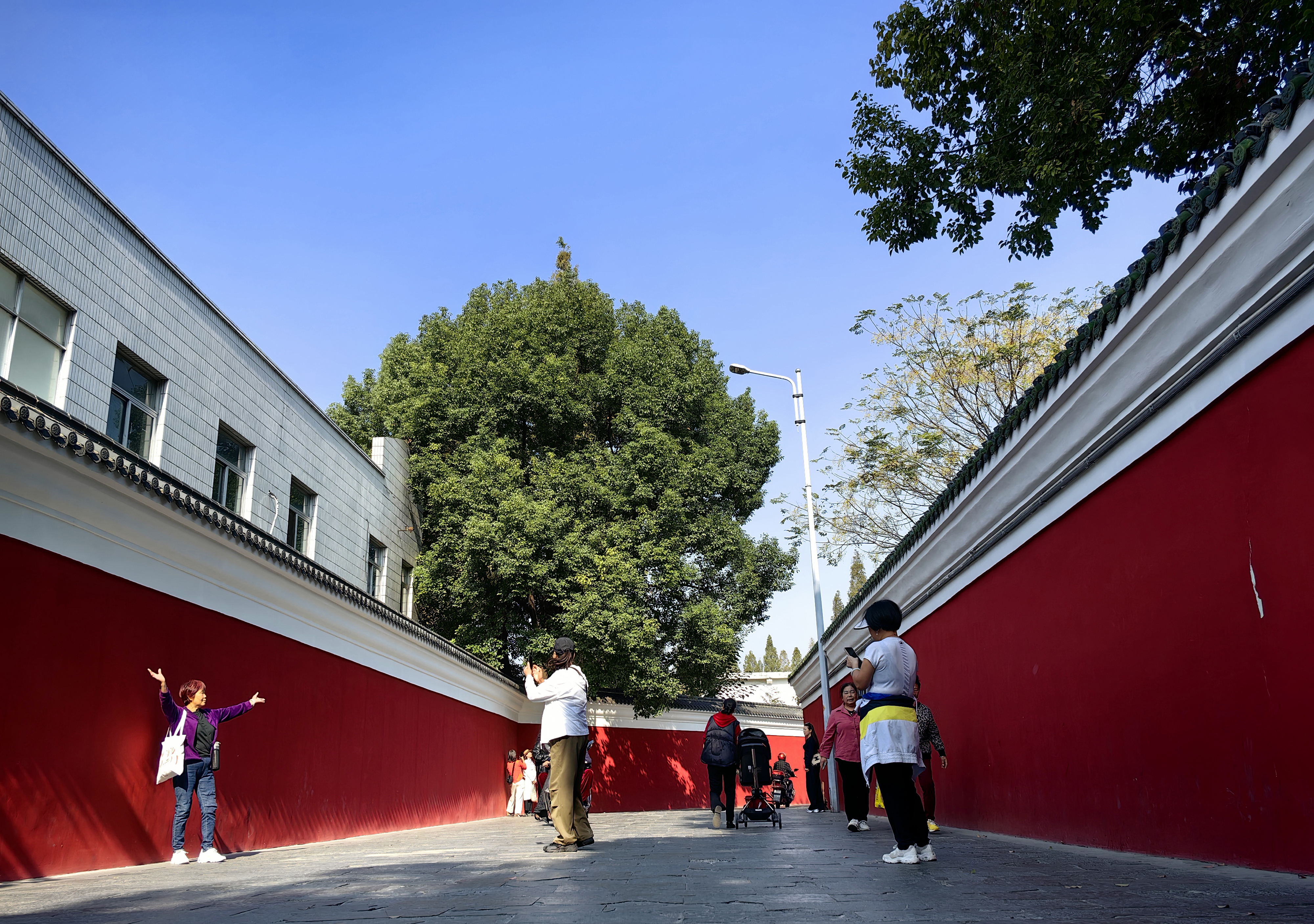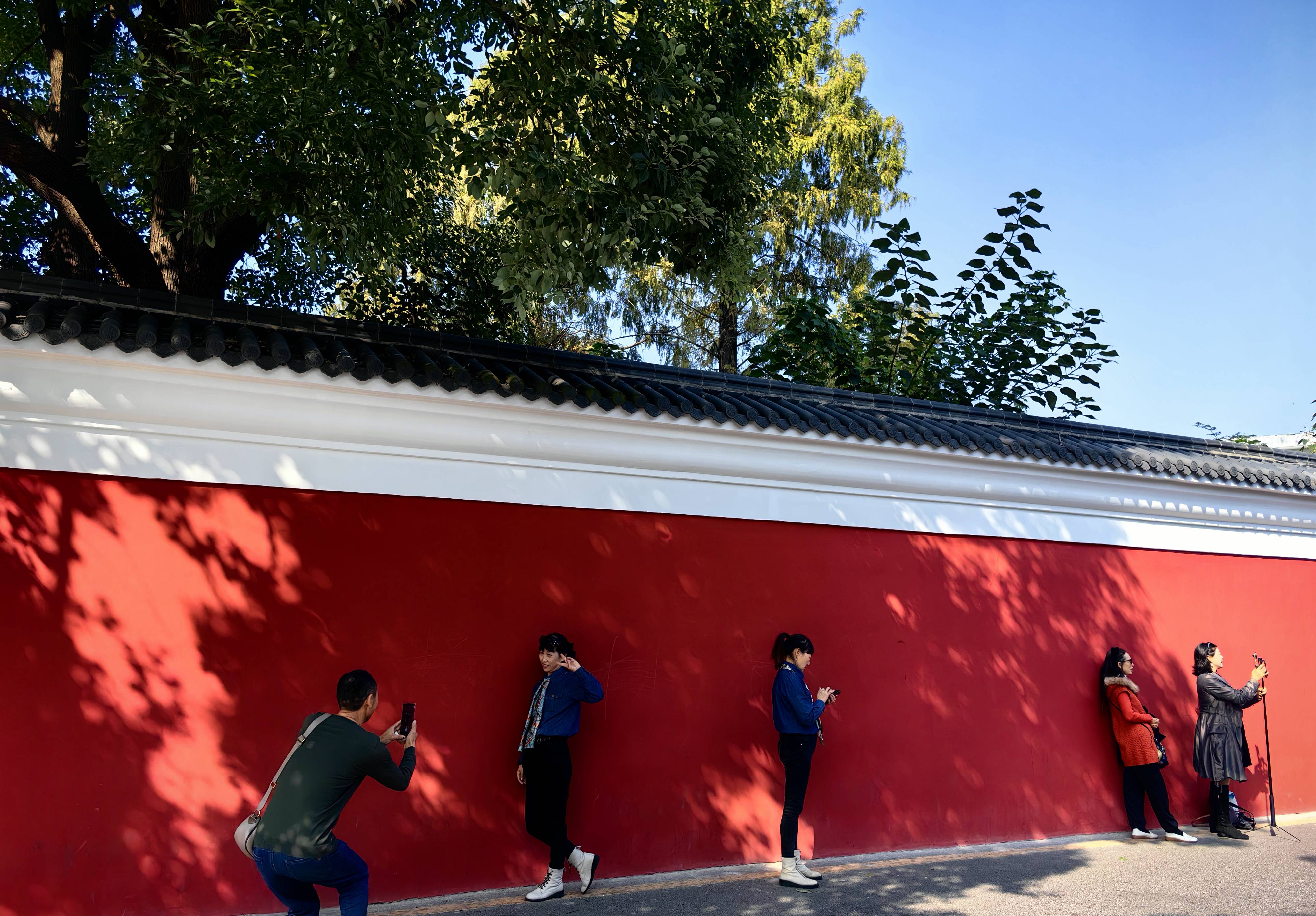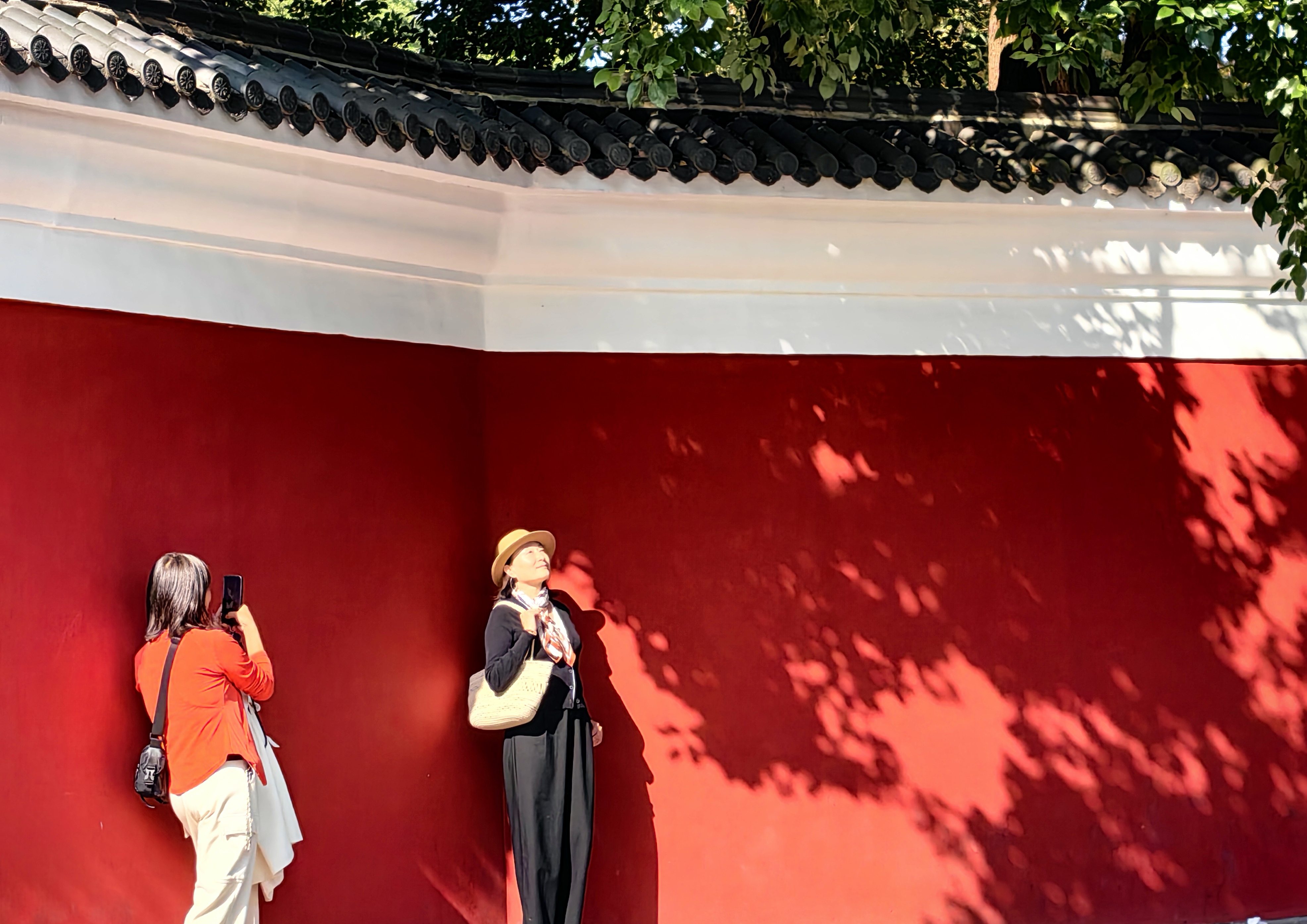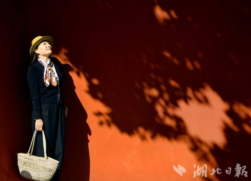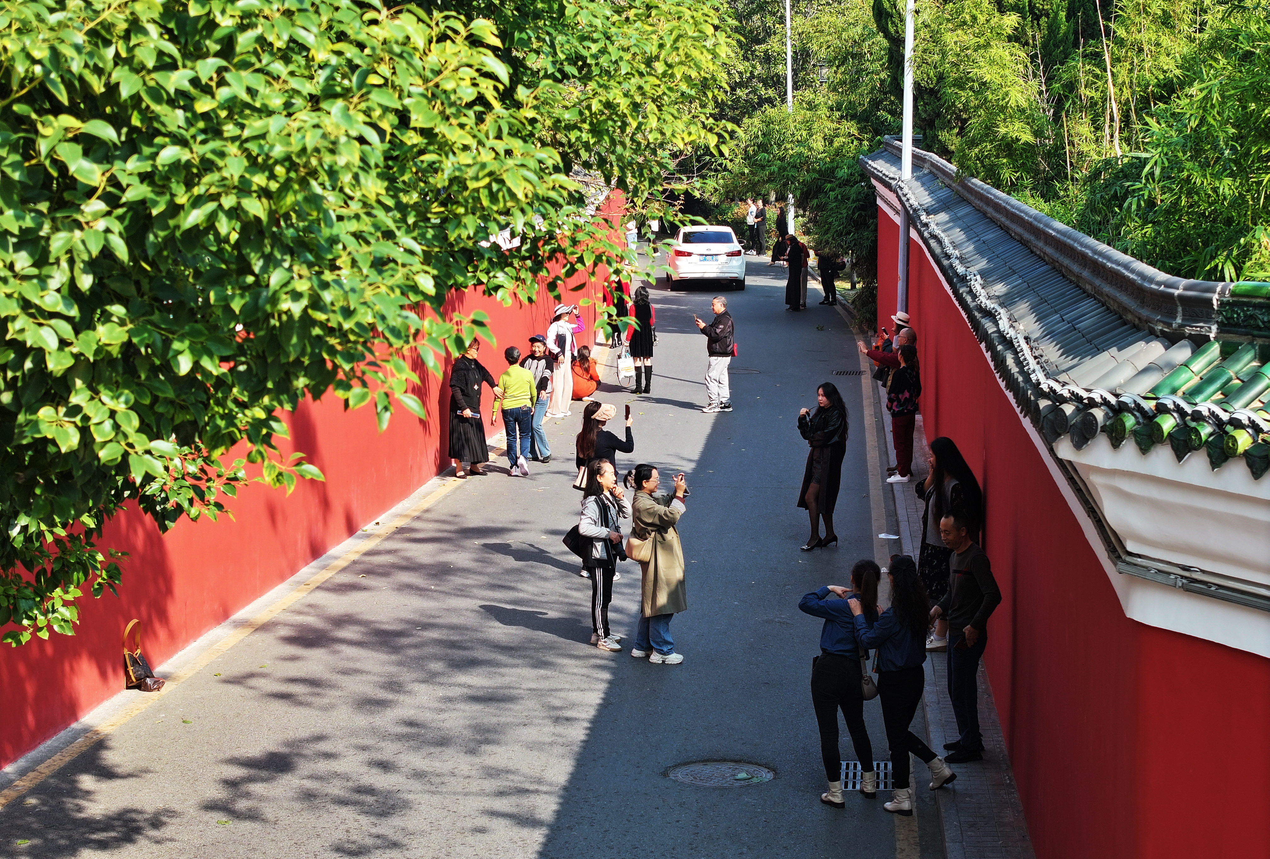 10月31日,游客在襄阳市襄王府外刷红焕新的外墙打卡拍照,阳光下的红墙琉璃瓦显得庄重、典雅,透出浓浓的中国古典建筑风。据介绍,该墙共345米长,参照故宫红墙色调,现场反复调试于9月底完成焕新,很快成为襄阳新的网红热门打卡地。(湖北日报全媒记者 田悦 通讯员 谢勇 摄)