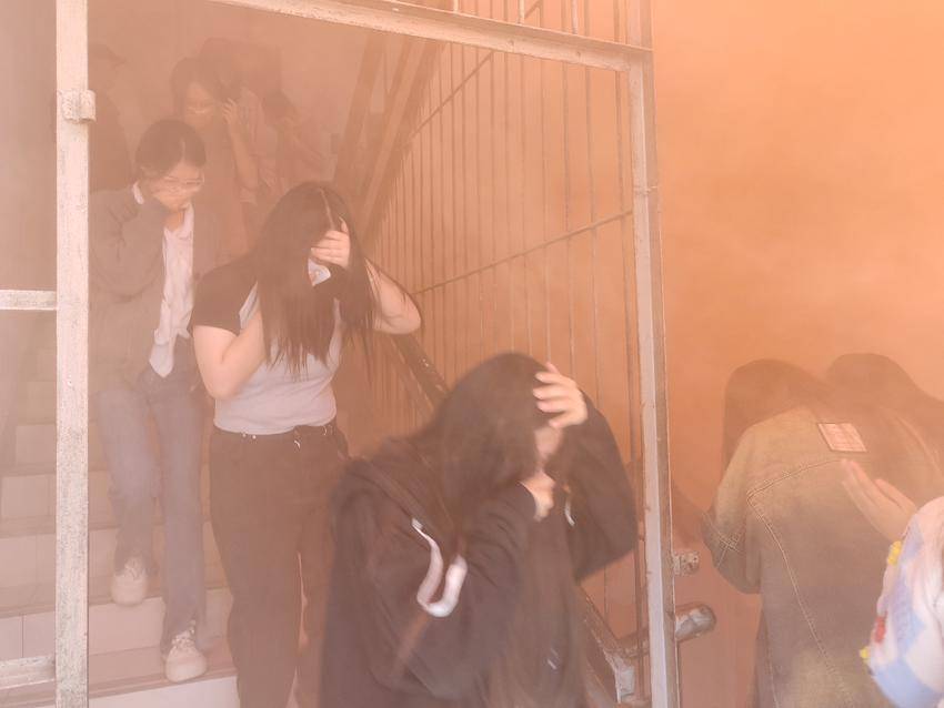 下午2点演练开始,随着消防警报的响起,演练正式开始。同学们在老师的组织下,迅速捂住口鼻,弯腰低姿,沿着学校指定的楼梯通道快速、有序地撤离到操场的安全地带。整个过程做到安全、快速、有序。