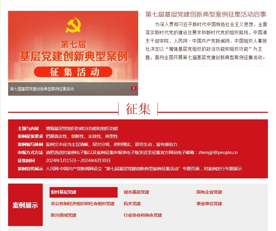 为全面落实新时代党的建设总要求和新时代党的组织路线,中国浦东干部学院、人民网·中国共产党新闻网、中国组织人事报社以“增强基层党组织的政治功能和组织功能”为主题,面向全国开展第七届基层党建创新典型案例征集活动。