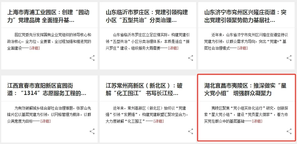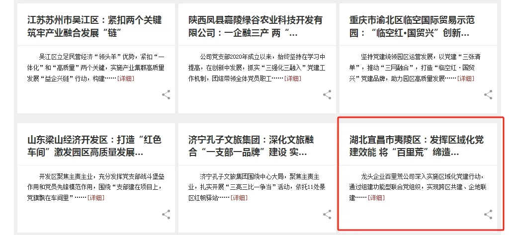 中共宜昌市夷陵区委组织部选送的《湖北宜昌市夷陵区:推深做实“星火党小组” 增强群众凝聚力》《湖北宜昌市夷陵区:发挥区域化党建效能 将“百里荒”缔造为“百里旺”》两个典型案例成功入围,目前该案例正在人民网·中国共产党新闻网“第七届基层党建创新典型案例征集活动”专题页面进行展示。