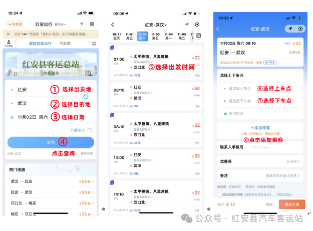 1、微信搜索“红安出行”小程序或“红安县汽车客运站”公众号
