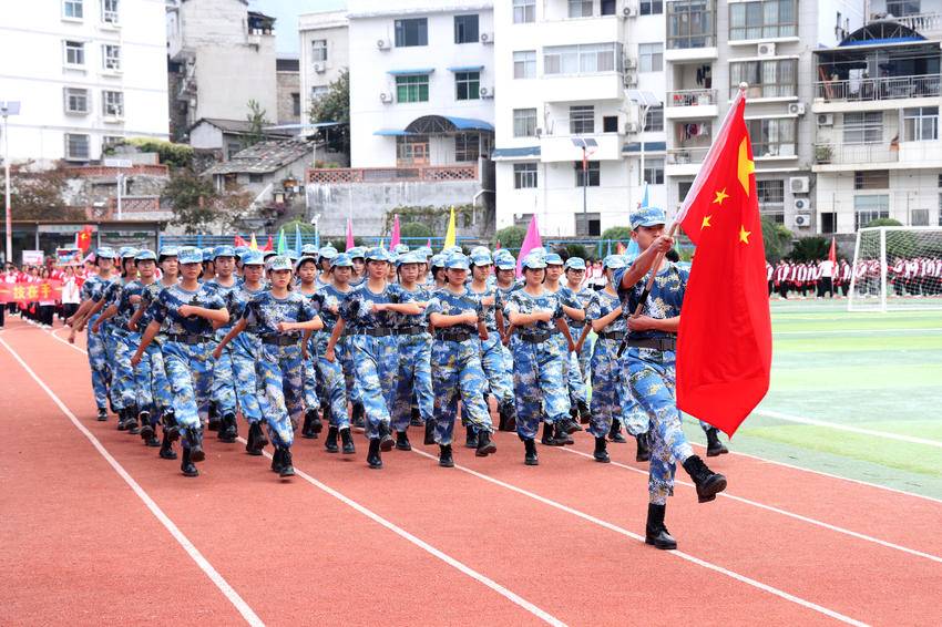 伴随着《运动员进行曲》的旋律,国旗队、校旗队、会标队、彩旗队、军鼓队、裁判队率先入场,紧随其后的是各班方队,同学们迈着矫健整齐的步伐,依次登场进行自编自导自演的入场式表演,一班一特色,一班一风格,精彩表演为入场式增色添彩。