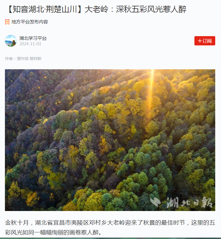 金秋十月,湖北省宜昌市夷陵区邓村乡大老岭迎来了秋景的最佳时节,这里的五彩风光如同一幅幅绚丽的画卷惹人醉。