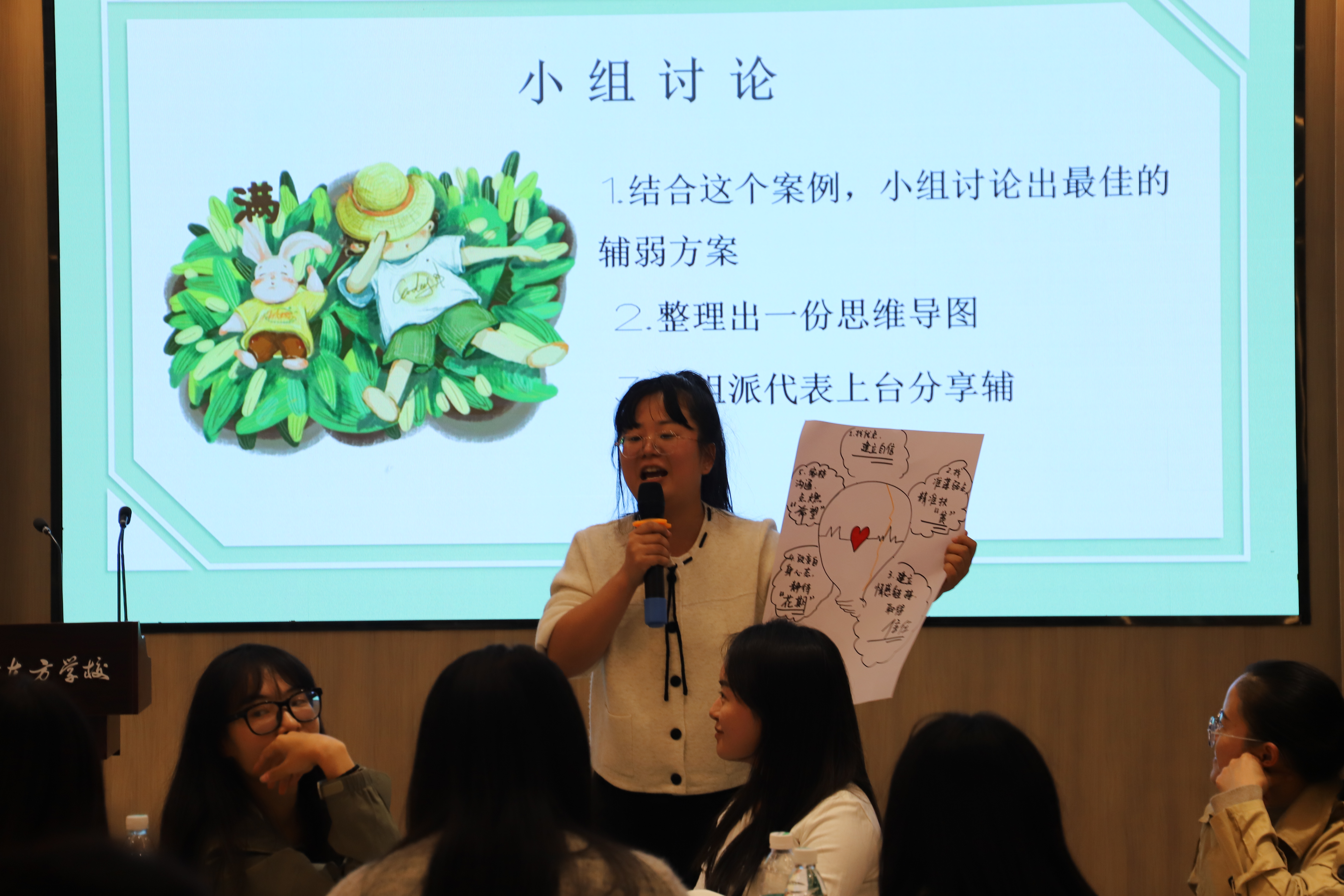 最引人深思的是“主动打怪升级”环节。周琦雨老师通过自身教育经历,提出了后进生成绩老是上不去的问题,引发了教师们的思考。各个小组主动思考,综合意见,绘制出各具特色的思维导图并进行了分享。