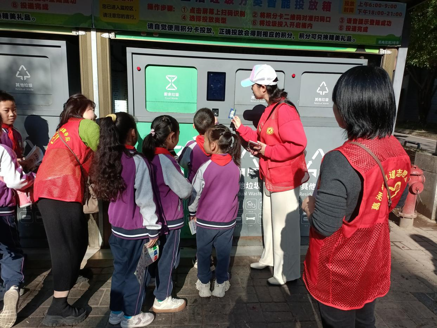 湖北日报客户端讯(通讯员李艳)11月2日上午,西陵区唐家湾小学212班的同学们在老师和家长的带领下来到葛洲坝街道东湖社区机电花苑小区参观智能垃圾分类箱,了解垃圾分类相关知识,增强环保意识。