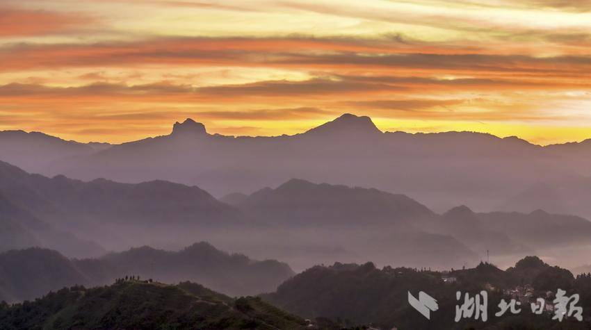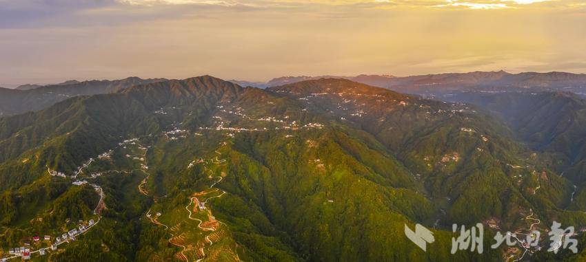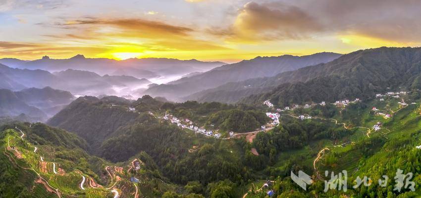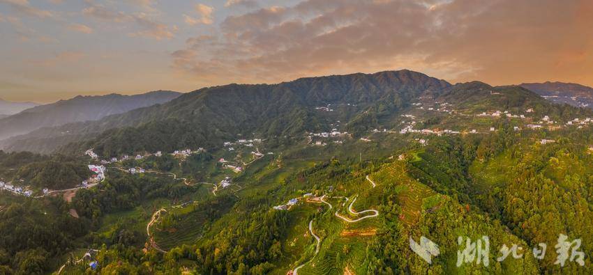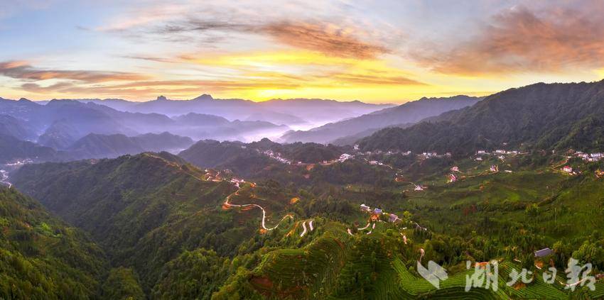湖北日报客户端讯(通讯员望作信、洪艳芳、应萍)近日,在宜昌市夷陵区邓村乡袁家坪村,五彩的日出光芒将满山的茶园照得通红,弯曲的公路也清晰地呈现在画面中。