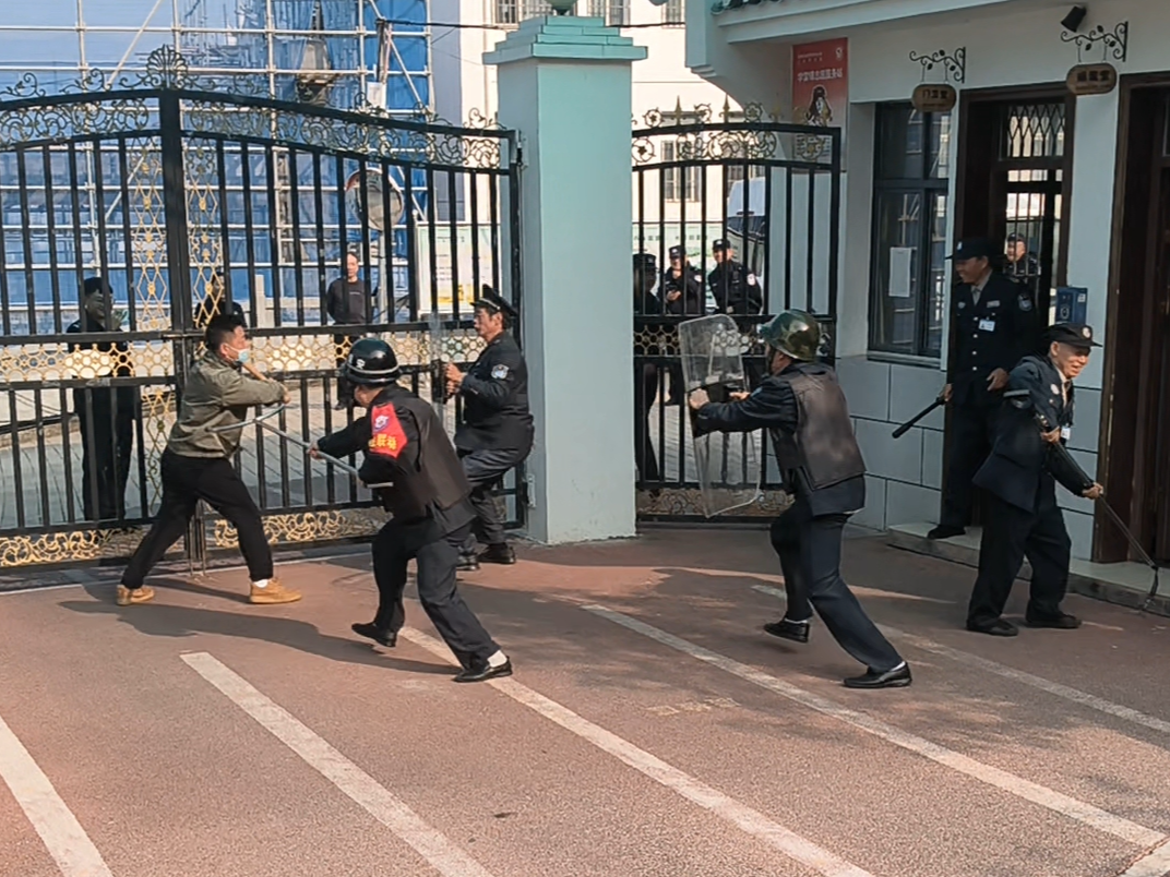 演练前,三斗坪派出所向全体保安介绍了防暴器械的正确使用方法,结合近期发生的校园安全事故讲解了遇到突发事件的应对方案。并现场为保安人员演示盾牌、钢叉等器械如何相互配合,制服暴恐分子。