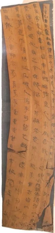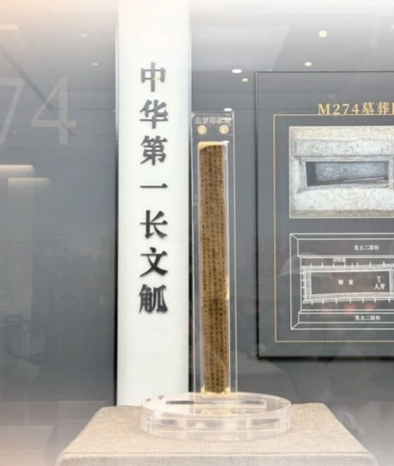 云梦县博物馆展厅内,出土于云梦郑家湖墓地的“中华第一长文觚”竖立在玻璃保护罩中。34厘米长的觚,由一截圆木竖着剖开而成,上书约700字,是目前所见年代最早、篇幅最长的长文觚。觚上所写,是战国后期一位名叫“筡”的纵横家游说秦王停战止戈的故事,文风和体例与传世文献《战国策》相似。