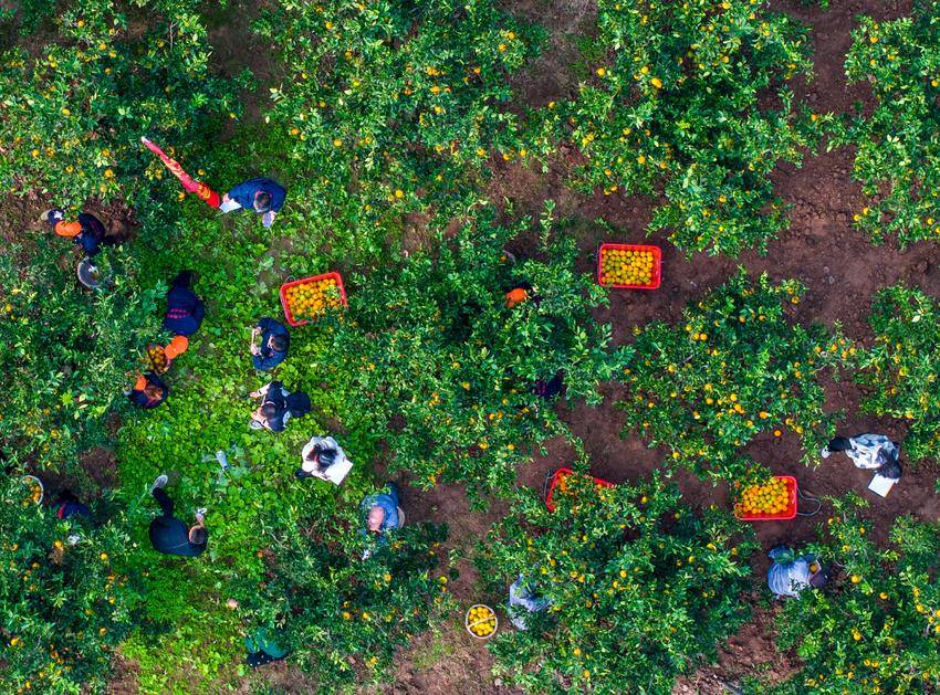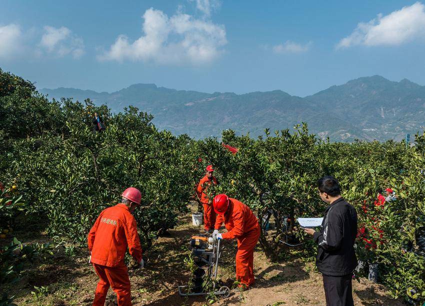 11月5日,队员在秭归县郭家坝镇熊家岭村进行橙园打孔施肥技能比武(无人机照片)。