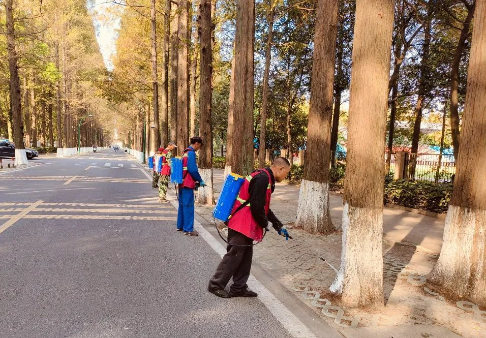 行动中,绿化工人们携带喷雾器,按比例配制涂白石灰。他们将石灰浆均匀地涂抹在树干上,每一处涂抹都严格把控,确保涂白高度一致、效果均匀、不留死角。这一工作不仅能够帮助树木抵御寒冷、防止虫害,还兼顾了整体的美观性,而且白色的树干在道路边十分醒目,为市民开车出行起到了良好的安全警示作用。