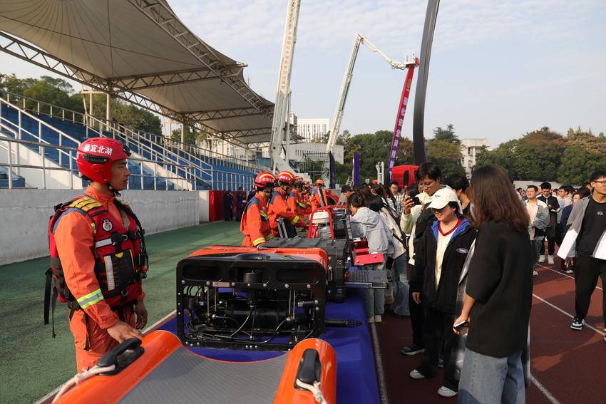 活动现场还组织开展了区消防救援大队消防器材装备展示、互动体验等观摩互动活动,以及三峡大学后勤保障服务部消防岗位技能竞赛,项目贴近实际,操作性强,技能竞赛分为自救呼吸器操作、消防水带连接、消防标识拼图、灭火器接力跑以及消防器材实操,进一步提升全民消防安全意识和自防自救能力。