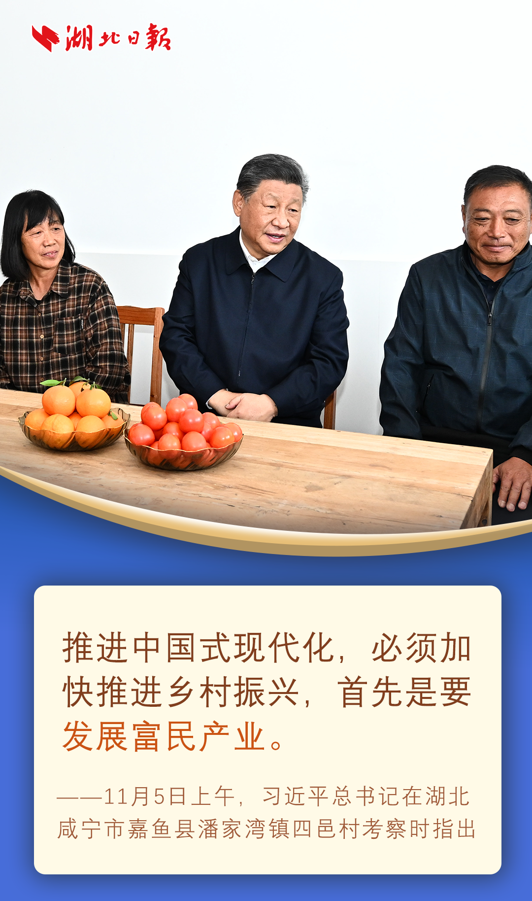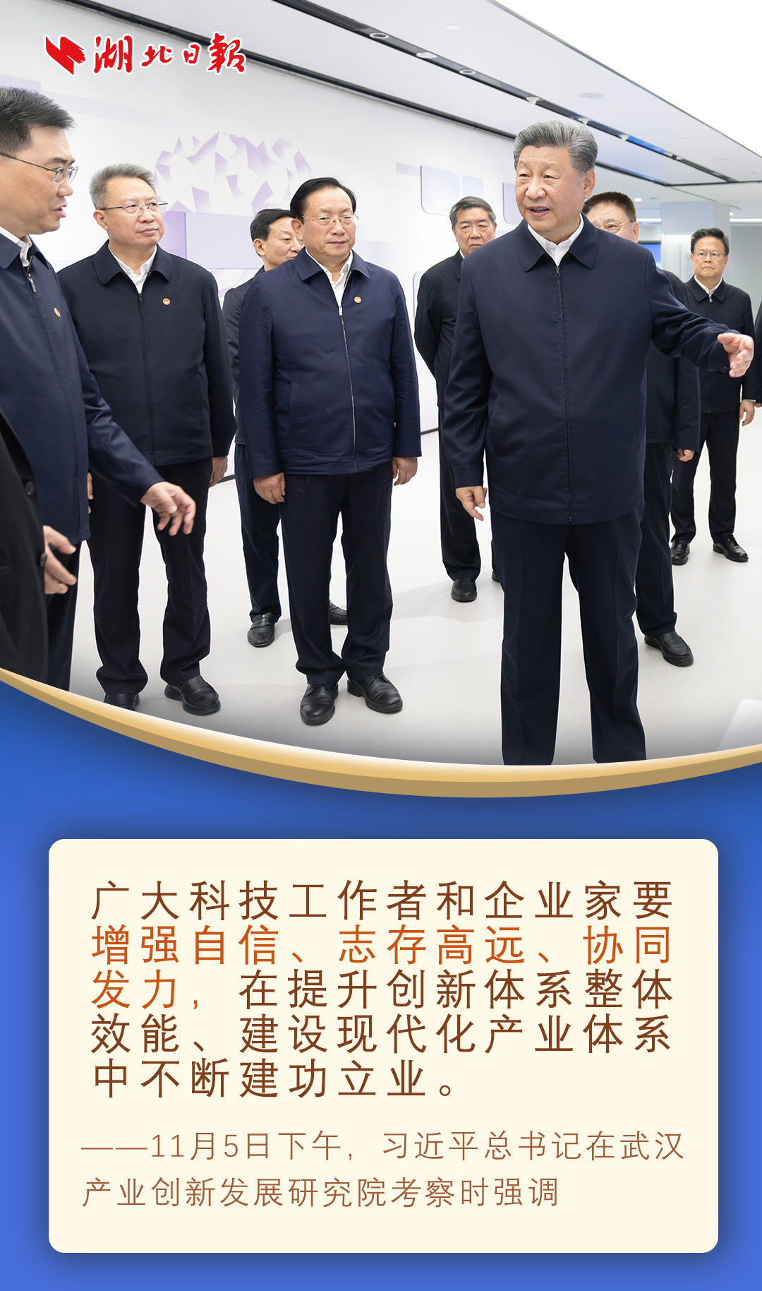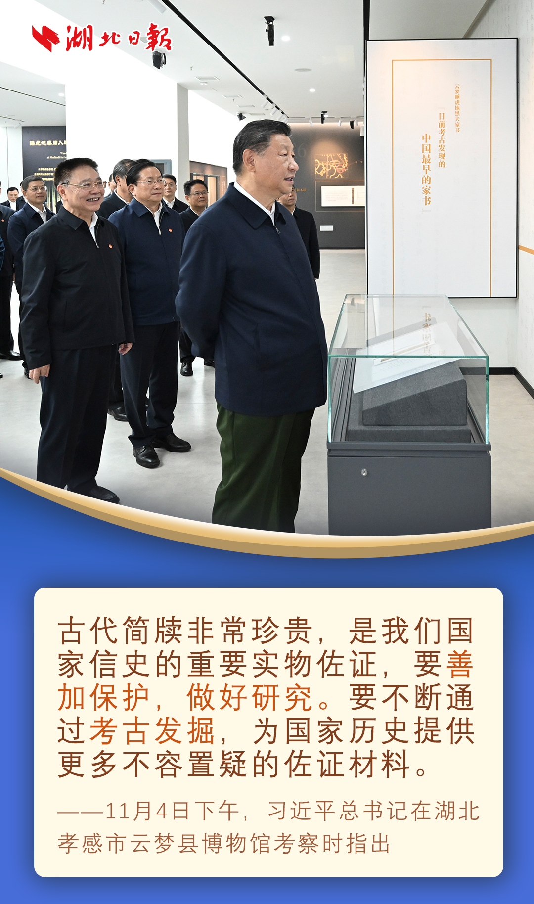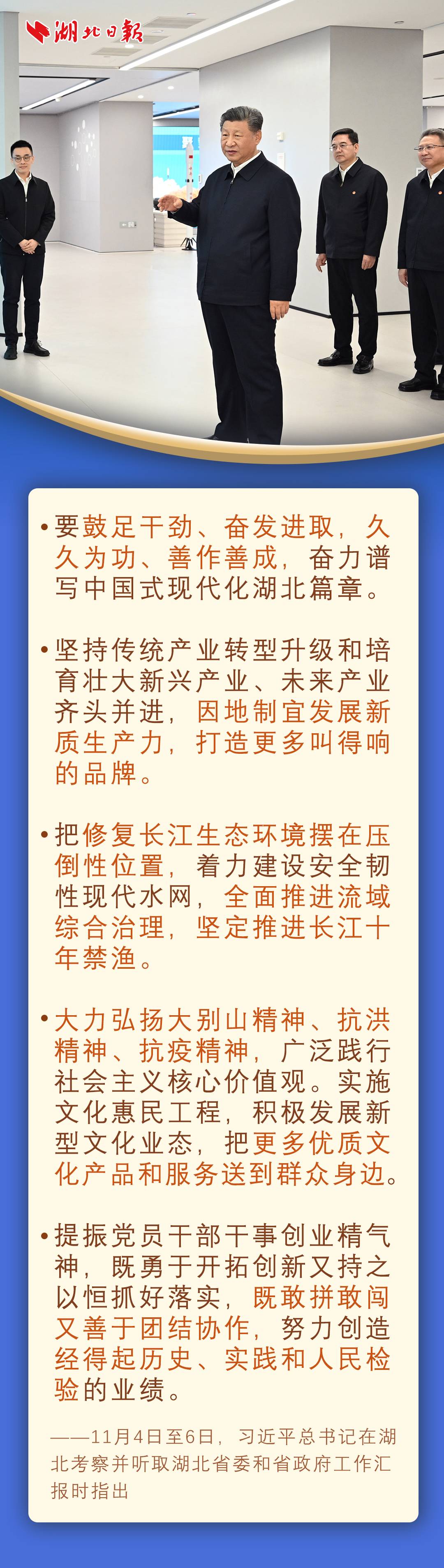 11月4日至6日,习近平在湖北省委书记王蒙徽和省长王忠林陪同下,先后来到孝感、咸宁、武汉,深入博物馆、农村、科技和产业创新平台考察调研。