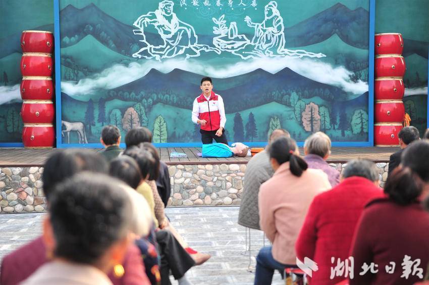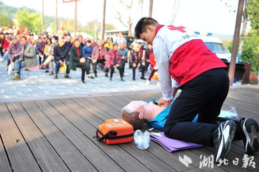 ↑ 龙泉镇青龙村村民在“自己动手 清洁家园”新时代文明实践活动现场观看红十字应急救护技能演示。