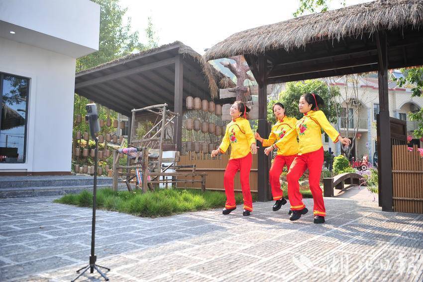 ↑ 龙泉镇艺术团演员在青龙村新时代文明实践活动广场排演并录制广场舞。