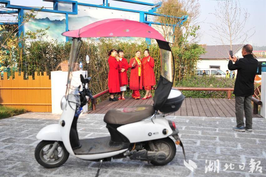 ↑ 龙泉镇艺术团演员在青龙村新时代文明实践活动广场拍照留影。