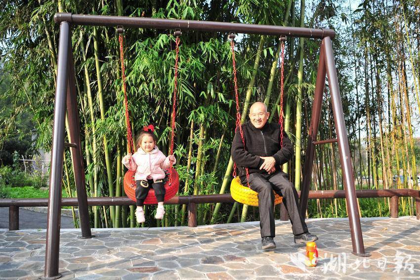 ↑ 龙泉镇青龙村村民陈姓义带着孙女在家门口的新时代文明实践活动广场开心荡秋千。