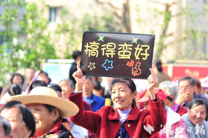 ↑ 龙泉镇青龙村村民在“自己动手 清洁家园”新时代文明实践活动现场举起“搞得蛮好”点赞牌。