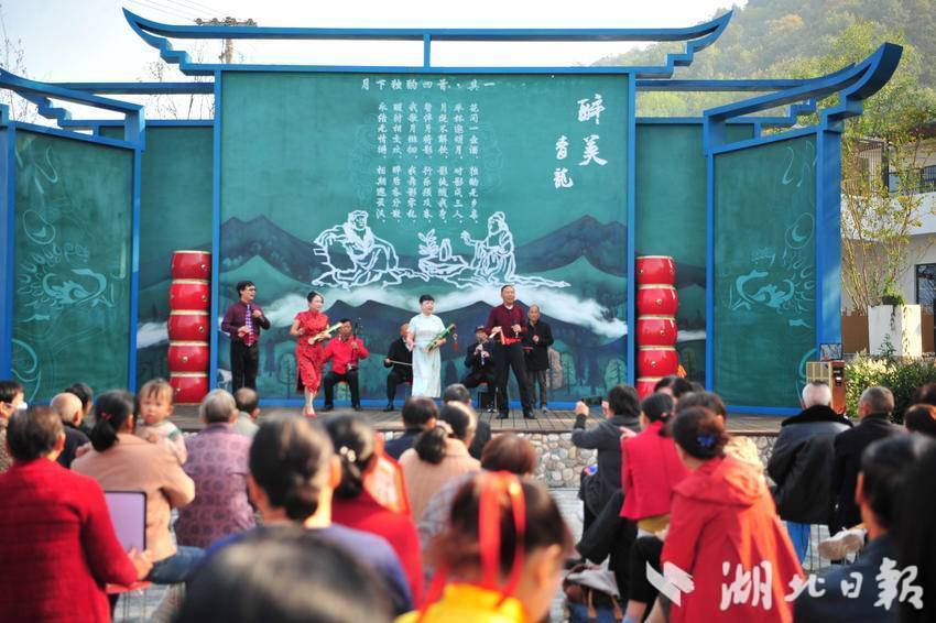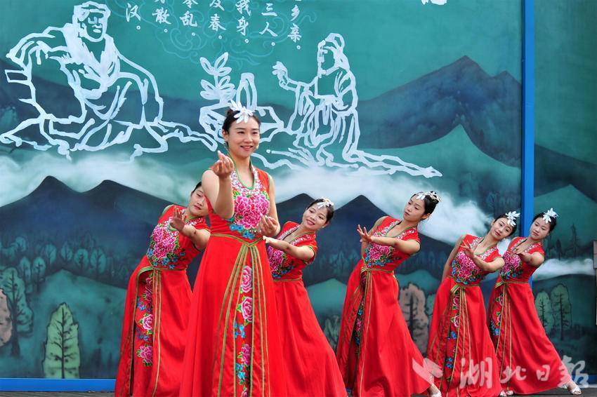↑ 夷陵歌舞团演员在“自己动手 清洁家园”新时代文明实践活动现场为村民展演歌舞节目。