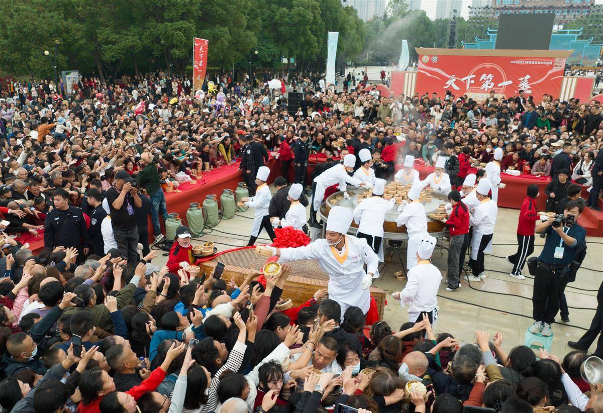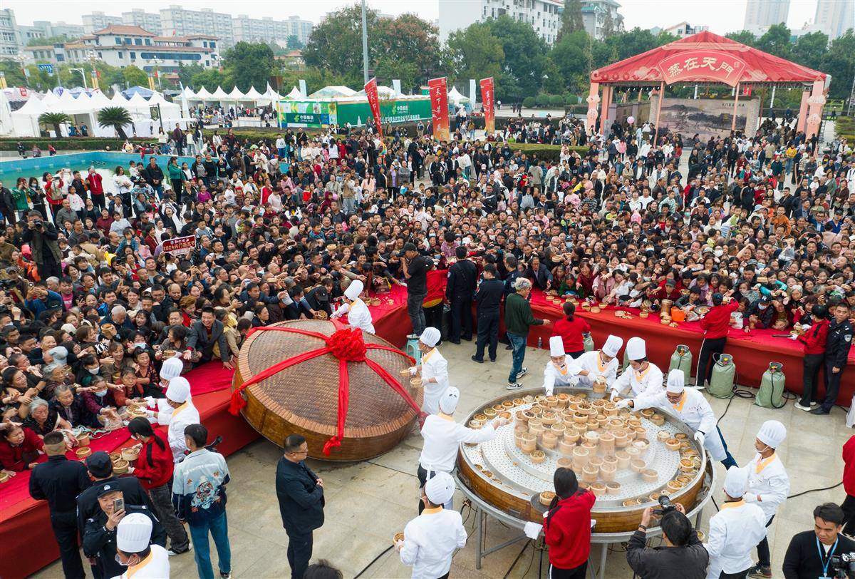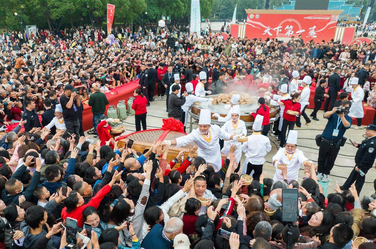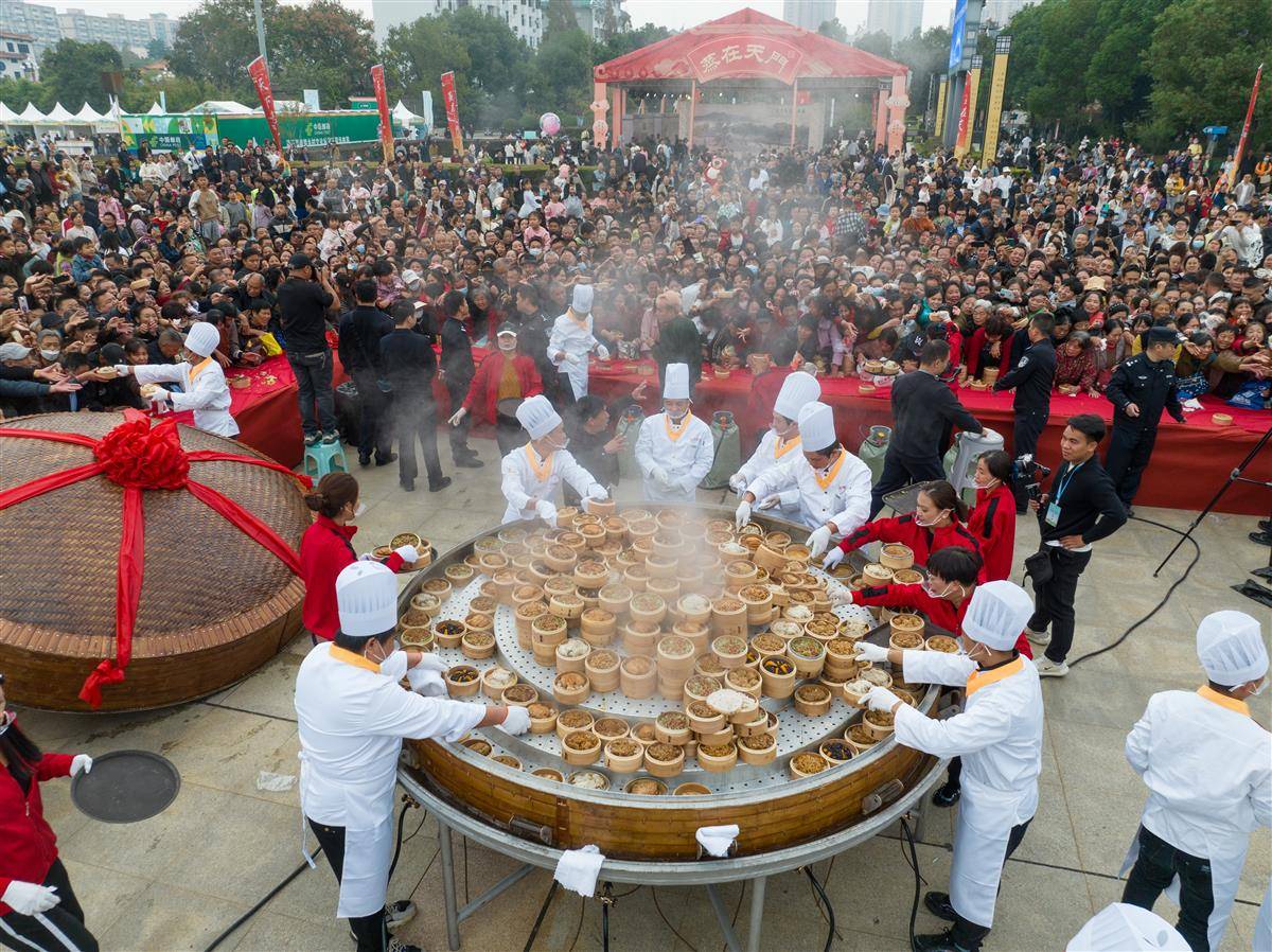 当天,天门举行“天下第一蒸”开笼仪式,1000道热气腾腾的蒸菜让市民和游客大饱口福。“天下第一蒸”笼高1.8米,直径约3米,共有5层,装有1000道蒸菜。菜品选择的是天门本地优质原材料,包括猪肉、牛肉、羊肉、甲鱼、鳝鱼、青鱼、黑鱼、泥鳅、时蔬等,由12名厨师用一整夜的时间烹制而成。天门蒸菜最早可上溯到石家河文明时期,至今有4600年的历史。