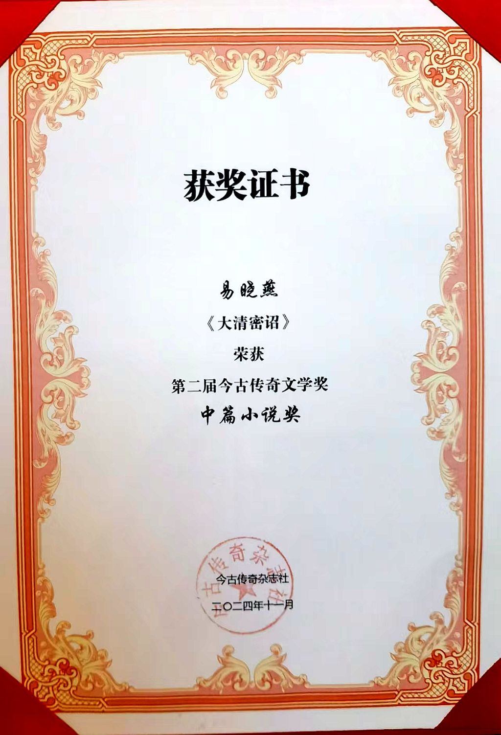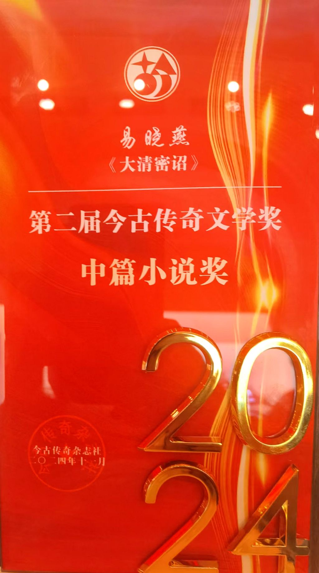 湖北日报客户端讯(通讯员何六一)11月8日,2024年度今古传奇优秀作者创作交流研讨会在湖南岳阳召开,来自全国各地的文学精英齐聚一堂,共同探讨中国文学的发展与未来。夷陵区作家易晓燕创作的小说《大清密诏》荣获第二届今古传奇文学奖中篇小说奖,为夷陵区文学界再添一枚璀璨的荣誉勋章。