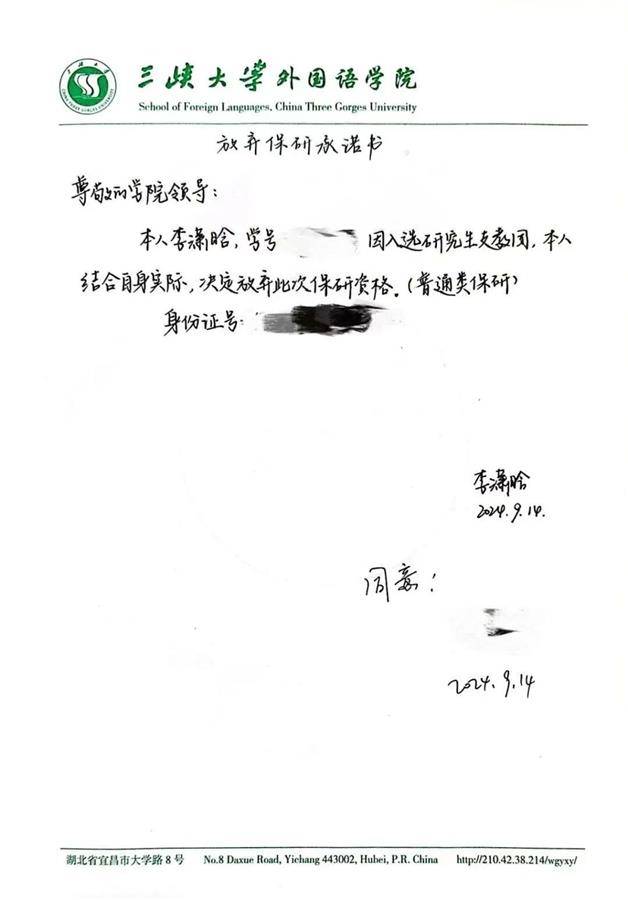 今年9月,她向学校提交放弃保研承诺书。明年8月,她将前往三峡腹地巴东支教一年,之后再回本校攻读硕士研究生。