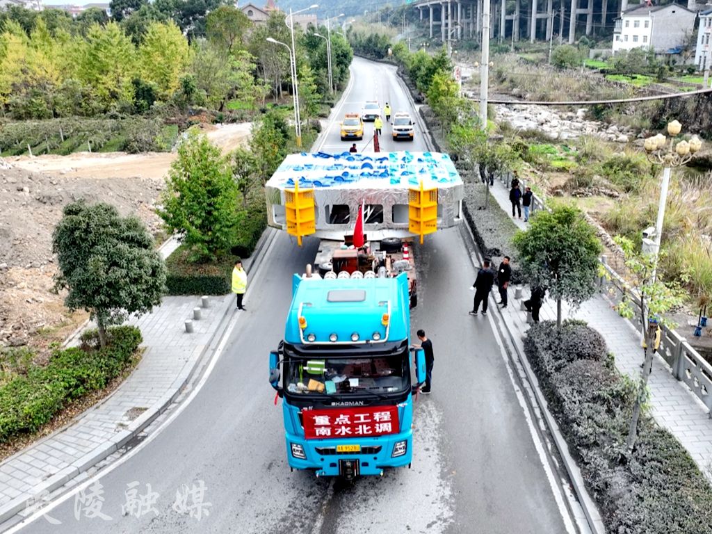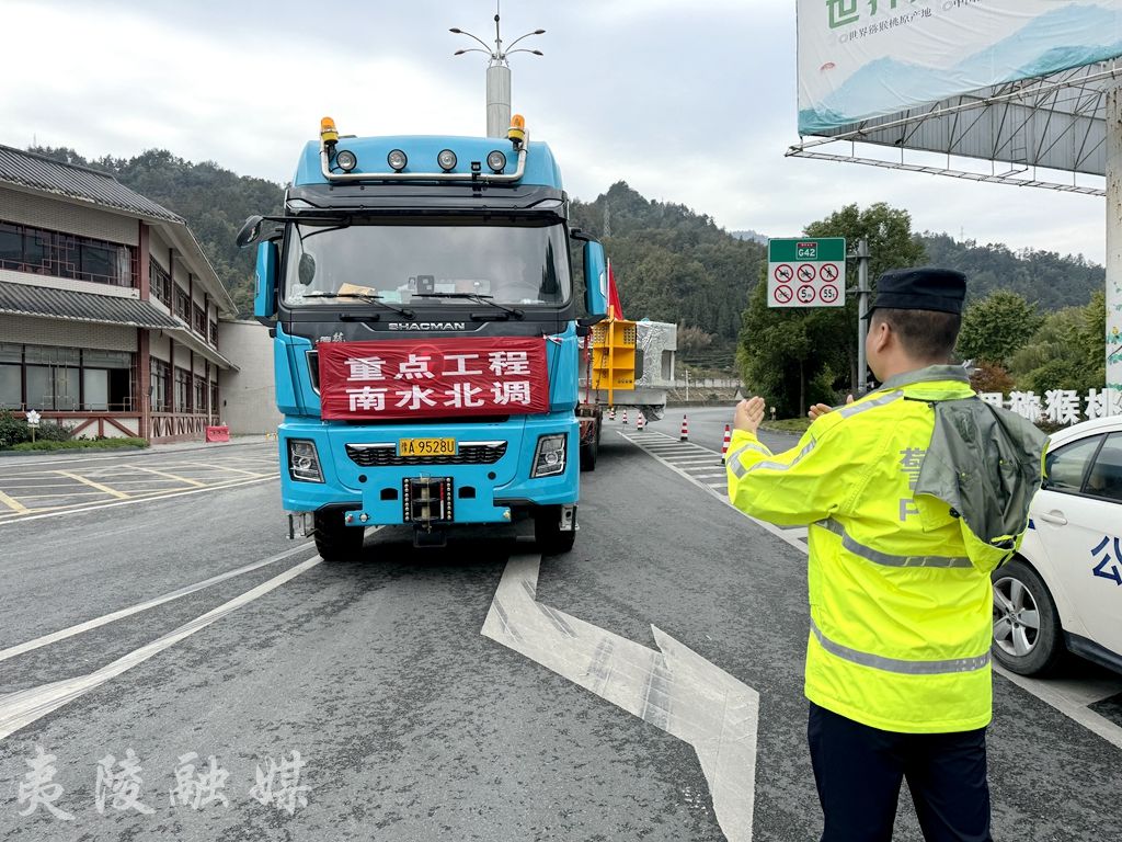 “好,向前向前,慢一点,向左向左,好,停停。”11月9日上午11点,一台装载着盾构机刀盘中心块的大型货车到达雾渡河高速路口,夷陵公安、交通部门早已在此接应,并于10日从雾渡河集镇安全护送到引江补汉工程夷陵段6号平洞。“我们前期做好了充分的勘察工作,采取分段管控对集镇路段进行绕行护送,以确保此次运输安全和道路畅通。”夷陵区交通运输监督服务中心副主任方维峰说道。