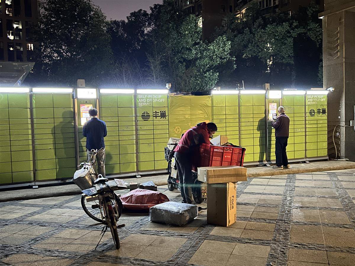 11月10日晚,武汉市武昌区某小区内,不少小区居民正忙着在快递柜领取双11大促期间购买的商品。(湖北日报全媒记者 黄磊 摄)