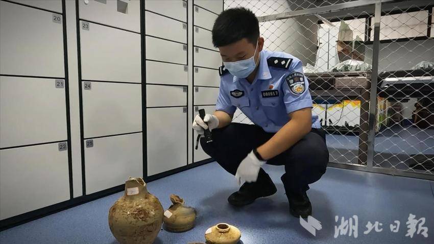 孝感民警陈特在讲解某盗墓案件中被追回的文物。