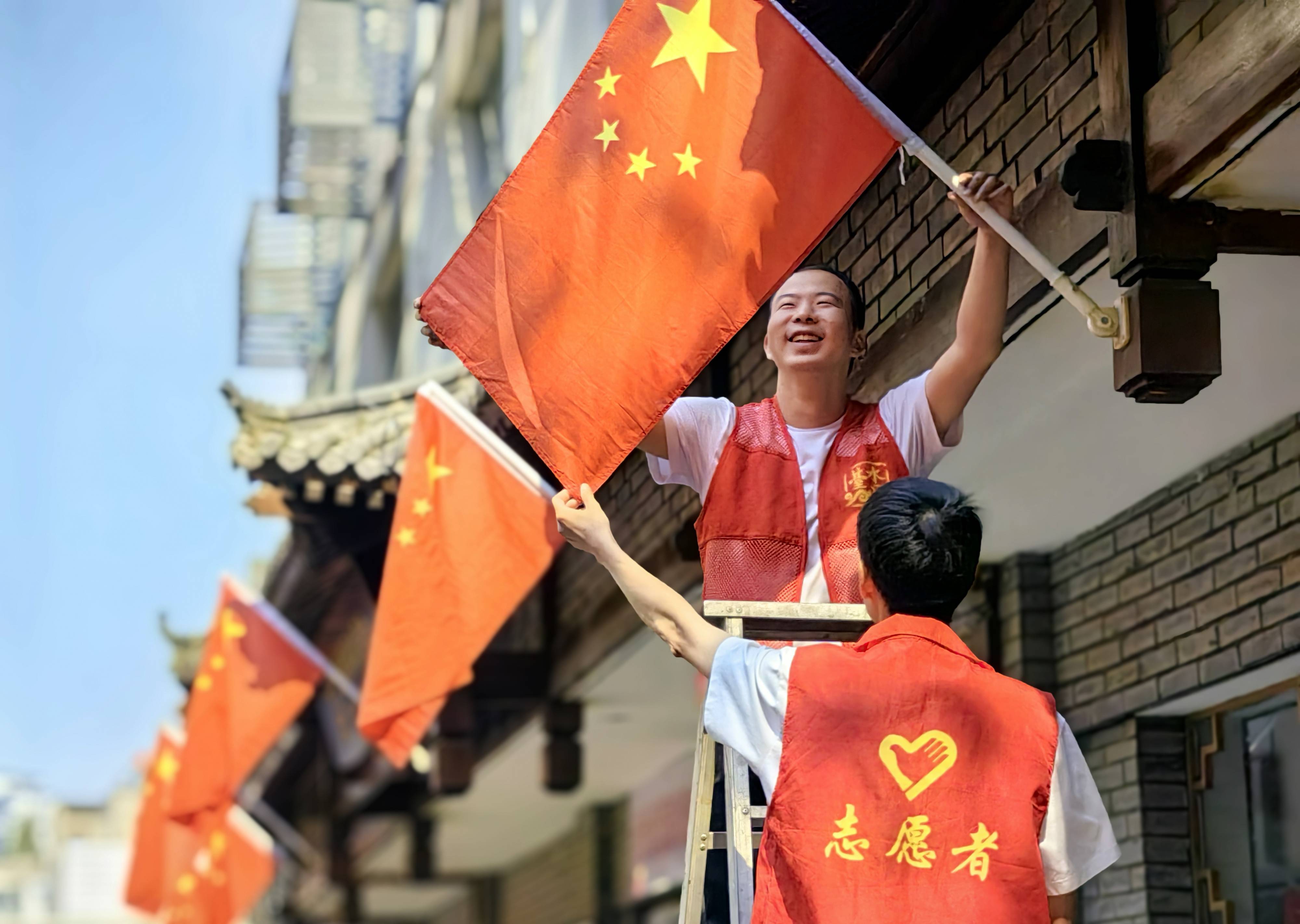今年国庆节前,襄阳市樊城区水星台社区志愿者在街巷悬挂五星红旗。(湖北日报全媒记者 田悦 通讯员 张沛 李冠男 摄)
