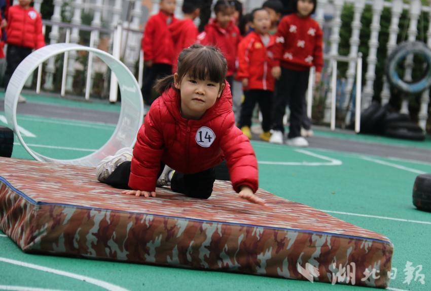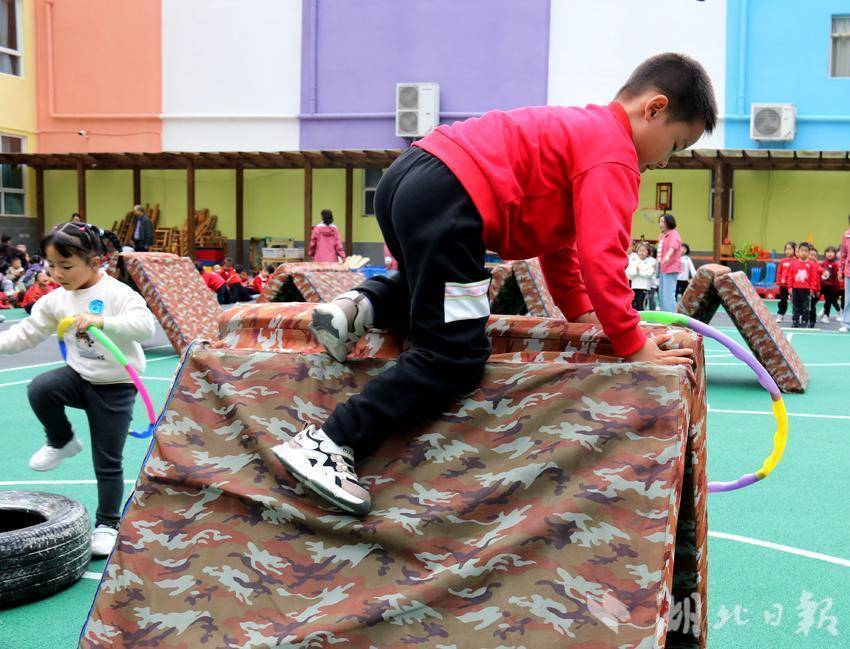 中班组的孩子们在疯狂小土豆、勇敢小士兵、金蝉脱壳、跨栏小达人等游戏中展现了他们的勇敢和机智。