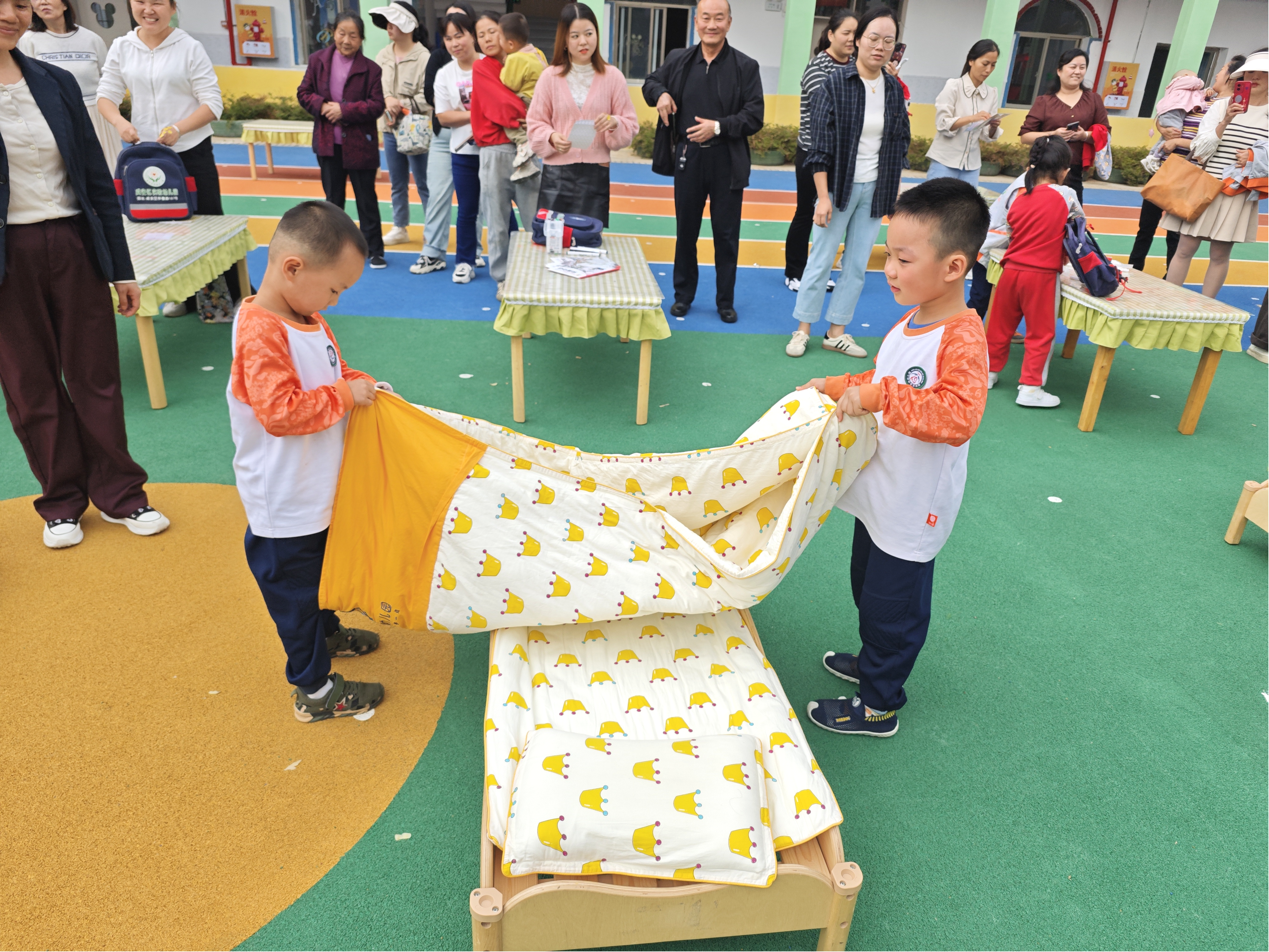 大赛根据幼儿的年龄特点和实际能力,设置了丰富多样的比赛项目。小班萌娃们挑战穿园服裤子、穿鞋子、剥橘子、整理绘本、叠毛巾等比赛,别看他们年纪小,认真的模样可爱极了。中班的小朋友们则进行了比赛穿园服套头衫、园服裤子、穿鞋子、剥豌豆、拧瓶盖等比赛,他们的动作愈发熟练,有条不紊。大班的孩子们迎来了更高难度的挑战,如穿园服三件套、整理床铺、整理书包、用筷子夹花生米等,他们展现出了较强的动手能力和自我管理意识。
