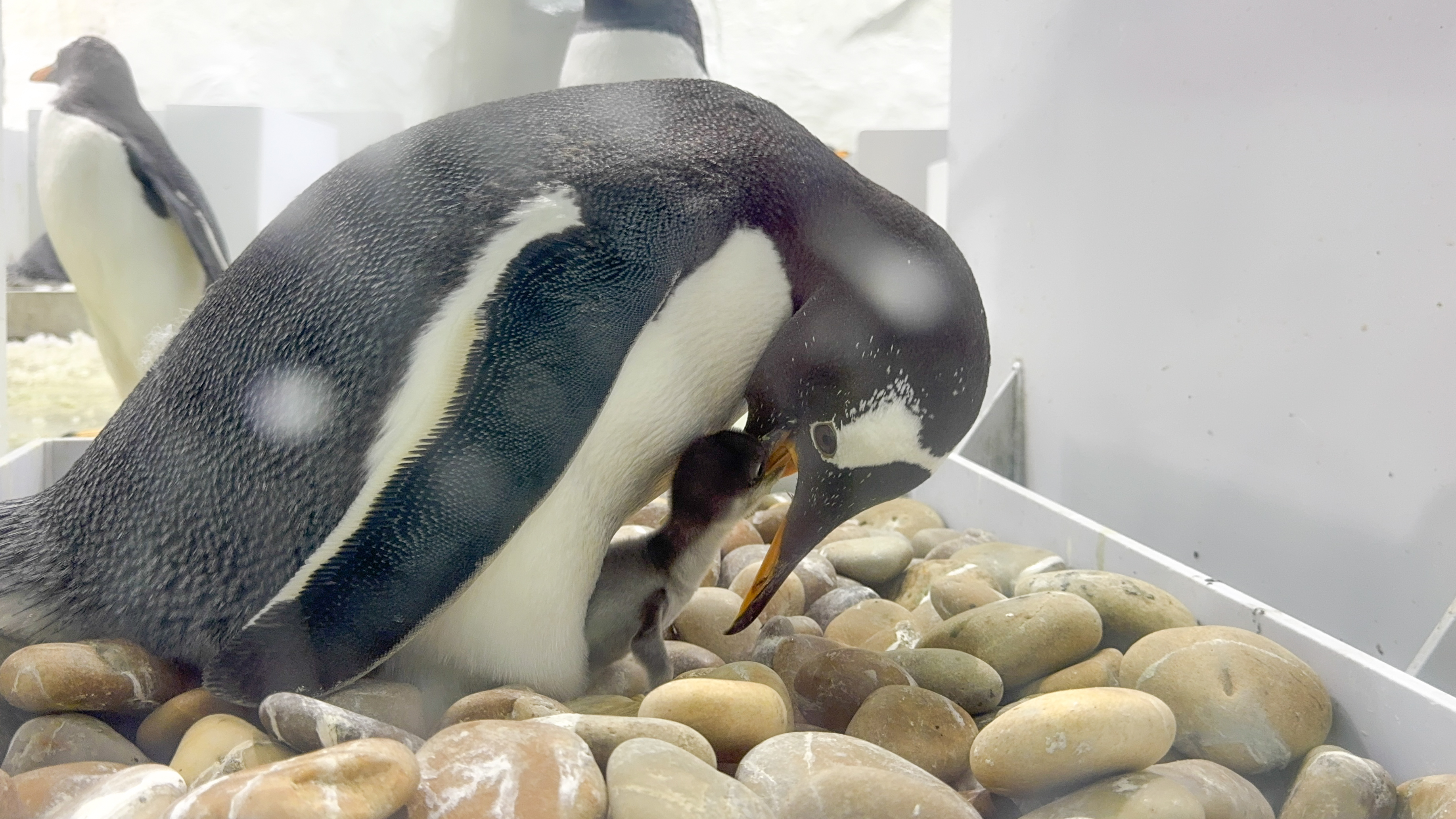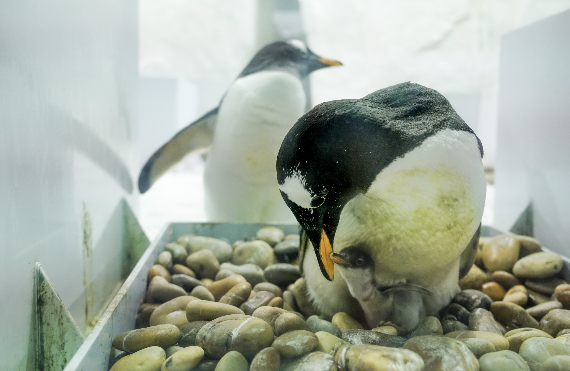 除了帝企鹅外,其它种类的企鹅都是由公母轮流孵化。李艳秋介绍,在圣亚海洋世界的巴布亚企鹅雄性孵化的比例大概是55%。