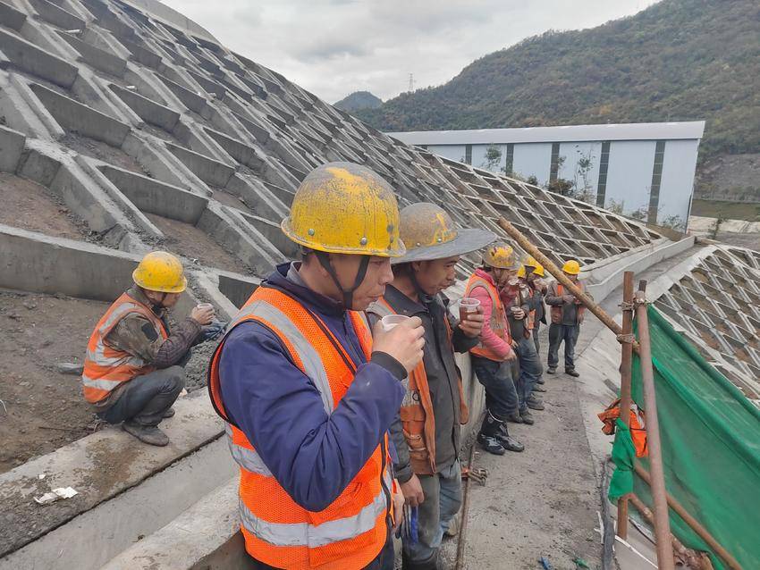“师傅们,来喝姜汤啦,暖暖身子!”年轻的党员陈宝林同志热情地招呼着贴坡混凝土施工现场的师傅们,他手中提着装满姜汤的暖瓶,就像捧着一团温暖的火焰。