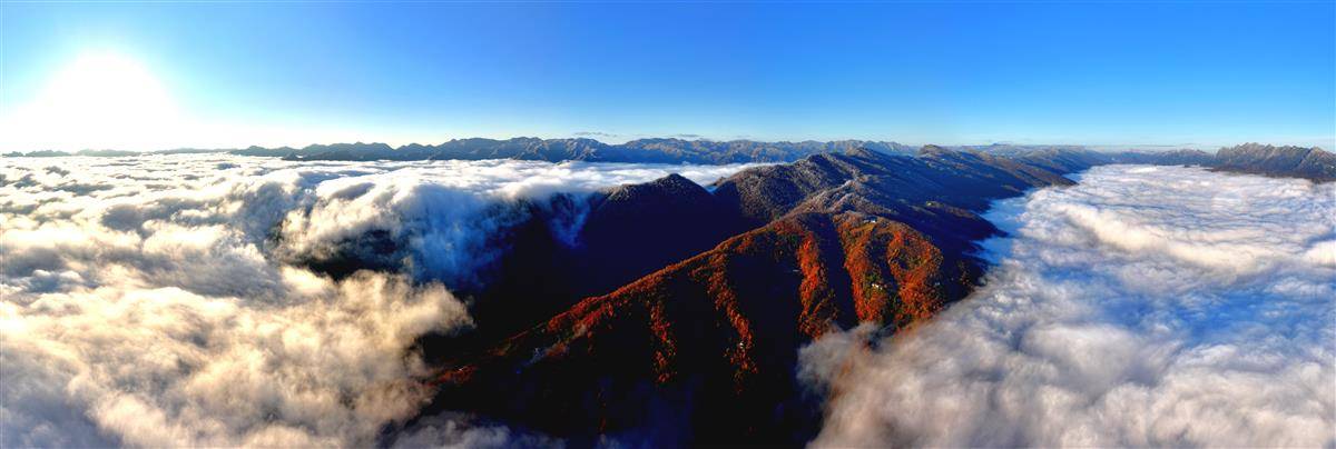 在神农顶景区神农谷景点举目眺望,只见座座银装素裹的山峦被云海所缠绕,山峰若隐若现、宛如仙境,蔚为壮观。漫天的云海在阳光的照射下,随风飘移,时而上升,时而下坠,时而回旋,时而舒展,构成一幅云海奇观。