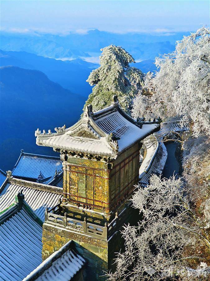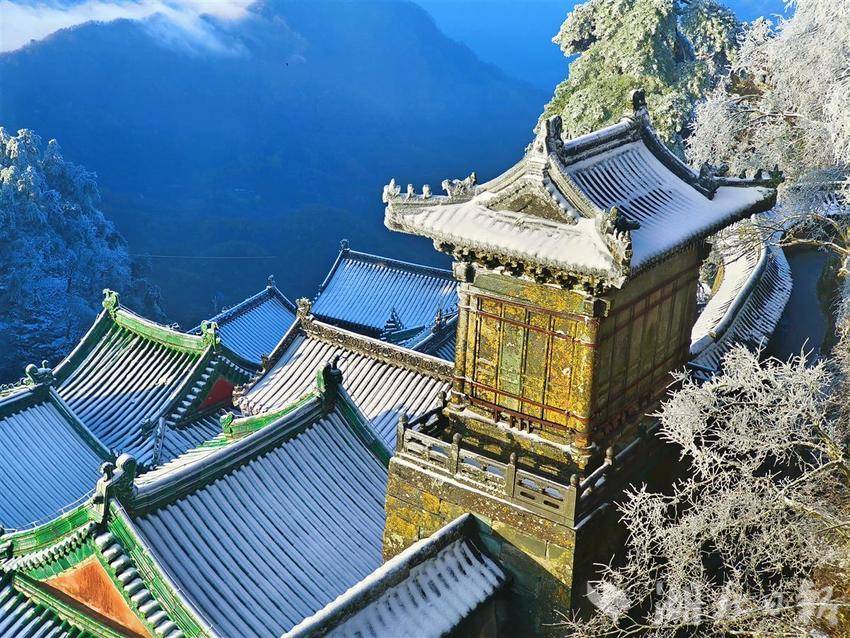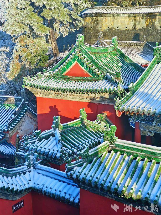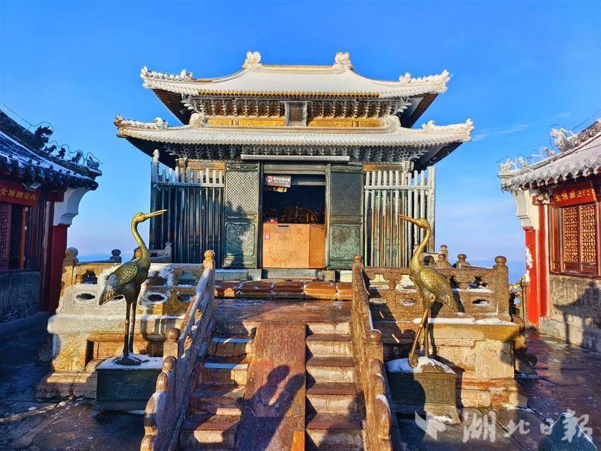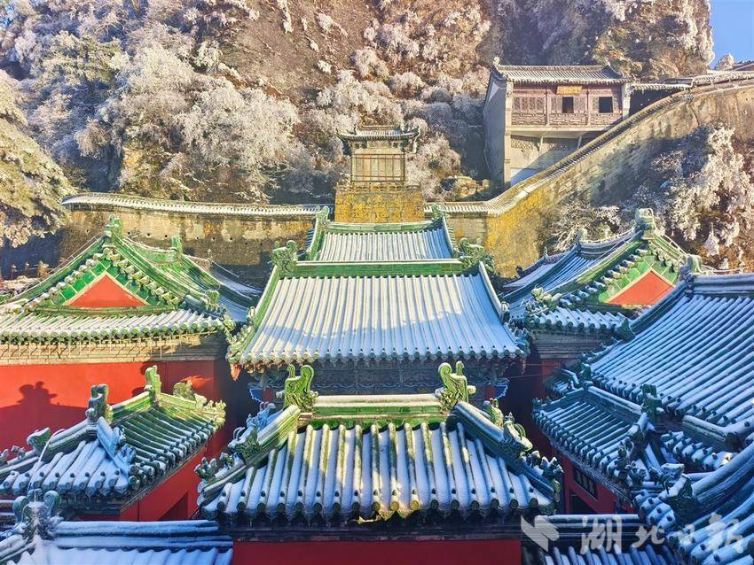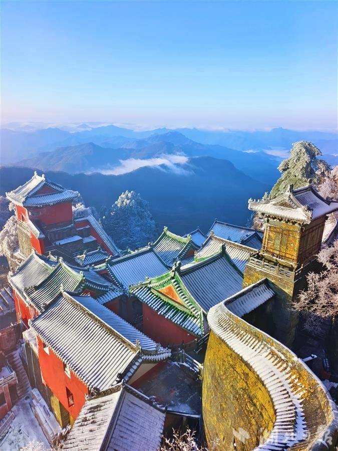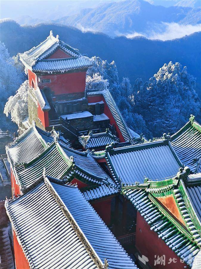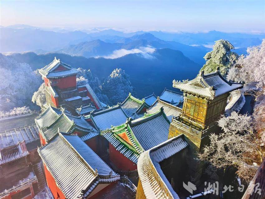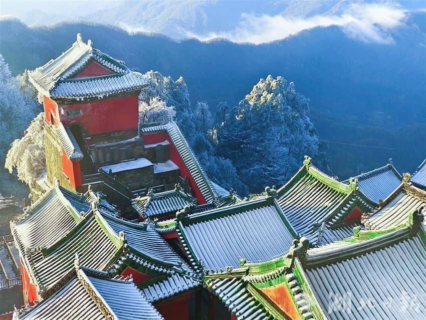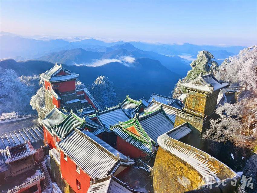 湖北日报讯(记者余宽宏、通讯员程鹏、许海芳、余相明、王桂生)11月20日上午,武当山景区雪后初霁,金顶在阳光的轻抚下,闪耀出璀璨的金色光芒。远处山峦在云海中若隐若现,与翻腾的云海相互交织,共同勾勒出一幅如梦如幻的人间仙宫图。