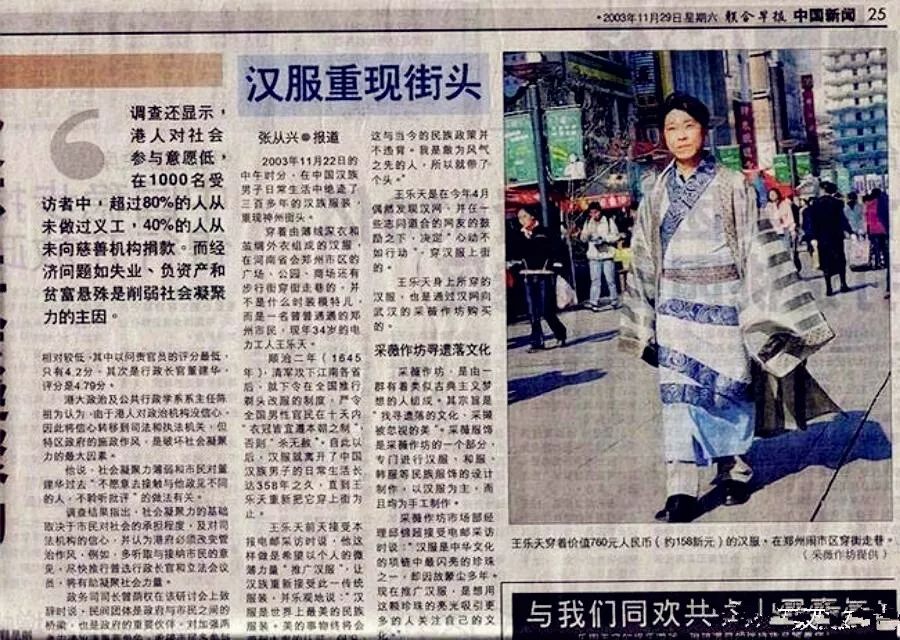2003年11月22日,郑州的王乐天穿着汉服走在街上被新加坡《联合早报》报道。为纪念这一天,汉服爱好者们把每年11月22日定为汉服出行日。