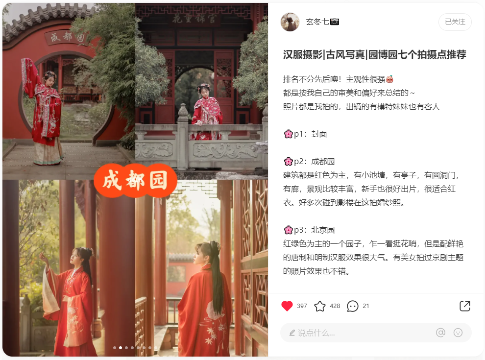 展园建筑的红色外墙适合各类拍摄背景,婚纱和古风类的摄影师们都爱来成都园。