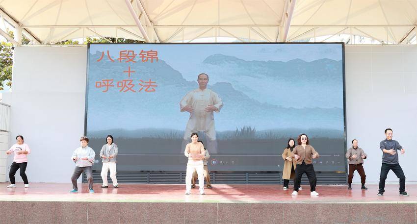 比赛由学校部分教师带来的八段锦表演拉开序幕。表演老师们时而展臂拉弓,时而双手托举,时而下蹬马步,动作柔中带刚,身形飘逸舒展,步态轻盈流畅,一开一合灵活自如,一张一弛挥洒有度,在一招一式间将八段锦柔和舒缓、圆活连贯的动作特点演绎得淋漓尽致,博得了现场观众的阵阵掌声。