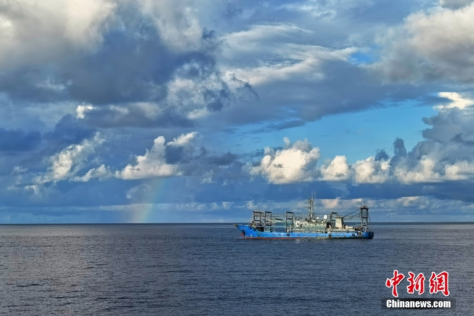 近段时间,中国海警舰艇编队在海南三沙黄岩岛海域开展维权执法活动。雨后的黄岩岛礁盘如绿色的彩带漂浮在深蓝色的海面,不时有来往渔船“穿过”彩虹在此作业。