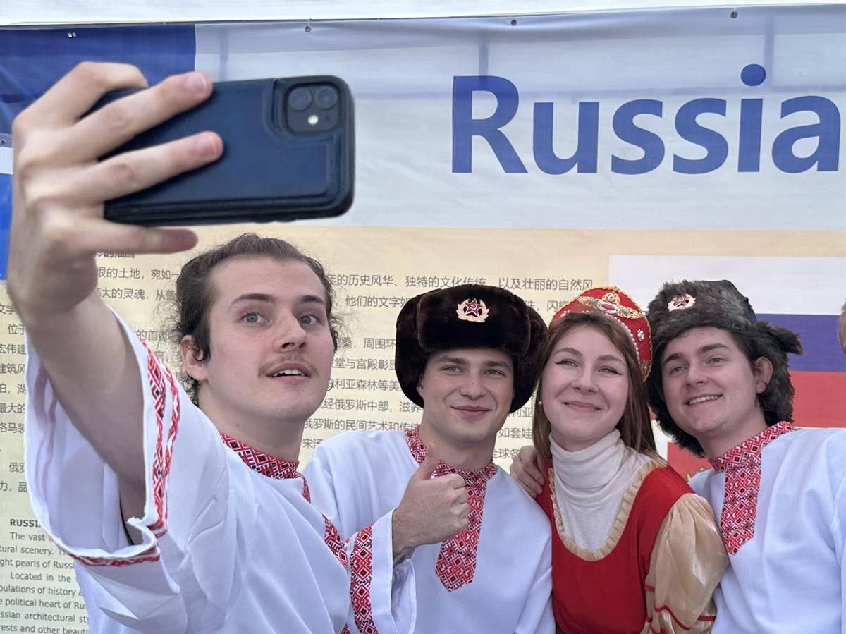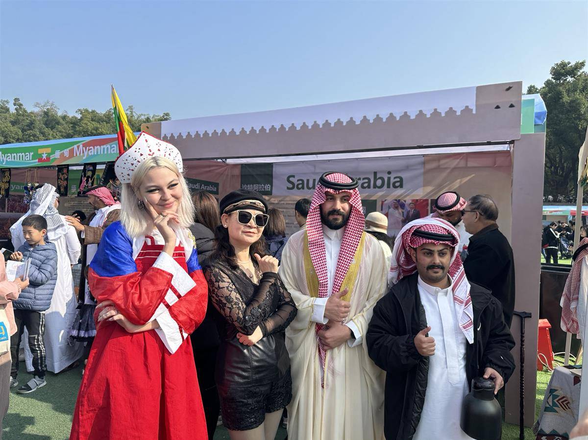 柬埔寨留学生们身着传统服饰跳起祝福舞,向观众传递最美好的祝愿;印度尼西亚留学生们手持哇扬戏皮影人偶,与观众们合影,作为印尼国粹的哇扬戏已传承逾千年;来自印度的留学生们载歌载舞,来自不同国家和地区的人们不断加入,一起融入热烈欢快的舞蹈中……