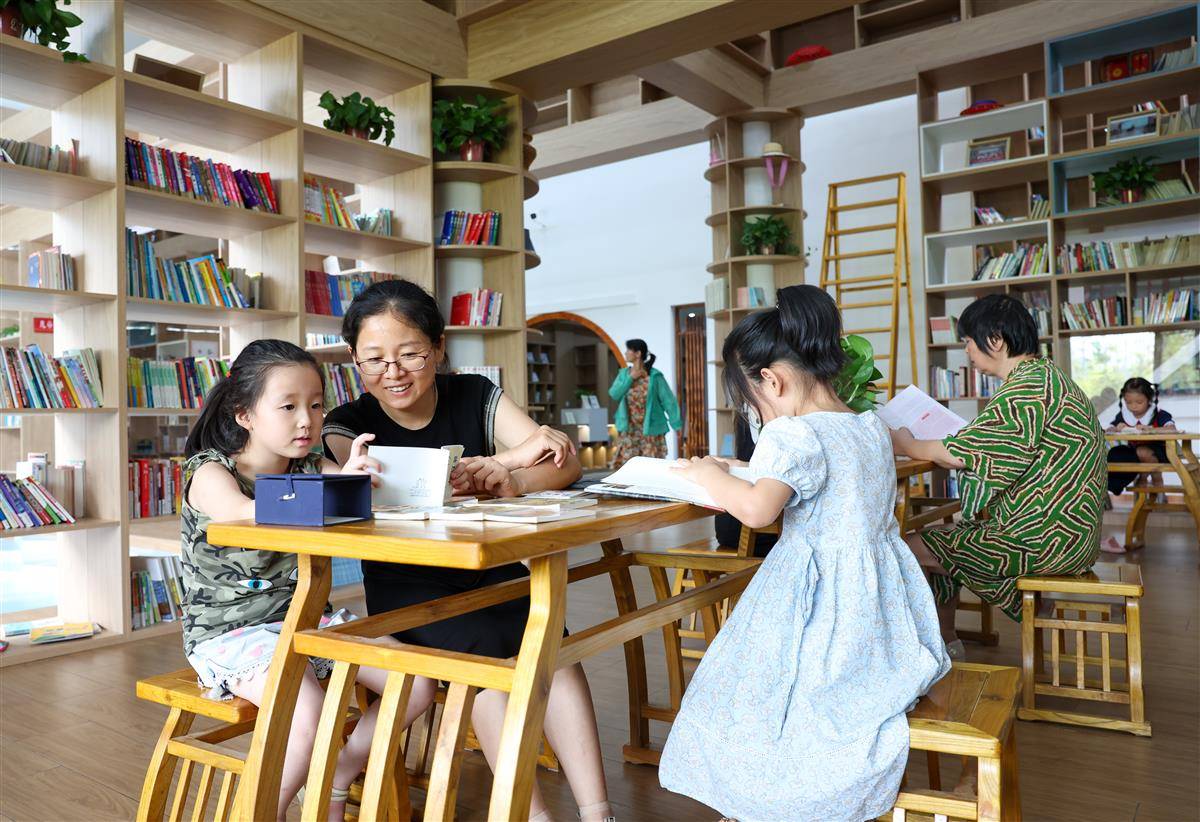 谷城县石花镇将军山村,志愿者陪伴孩子们在村农耕书屋看书。