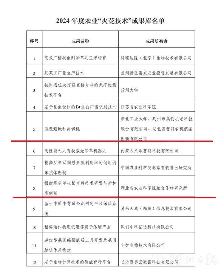 湖北日报讯(记者汪彤)近日,农业农村部公布2024年度农业“火花技术”名单,共有10项成果纳入培育名单、30项成果纳入成果库。我省微型鳝鳅秒剖切机和极耐寒多年生稻育种技术研发与新种质创制两项成果纳入“火花技术”成果库。