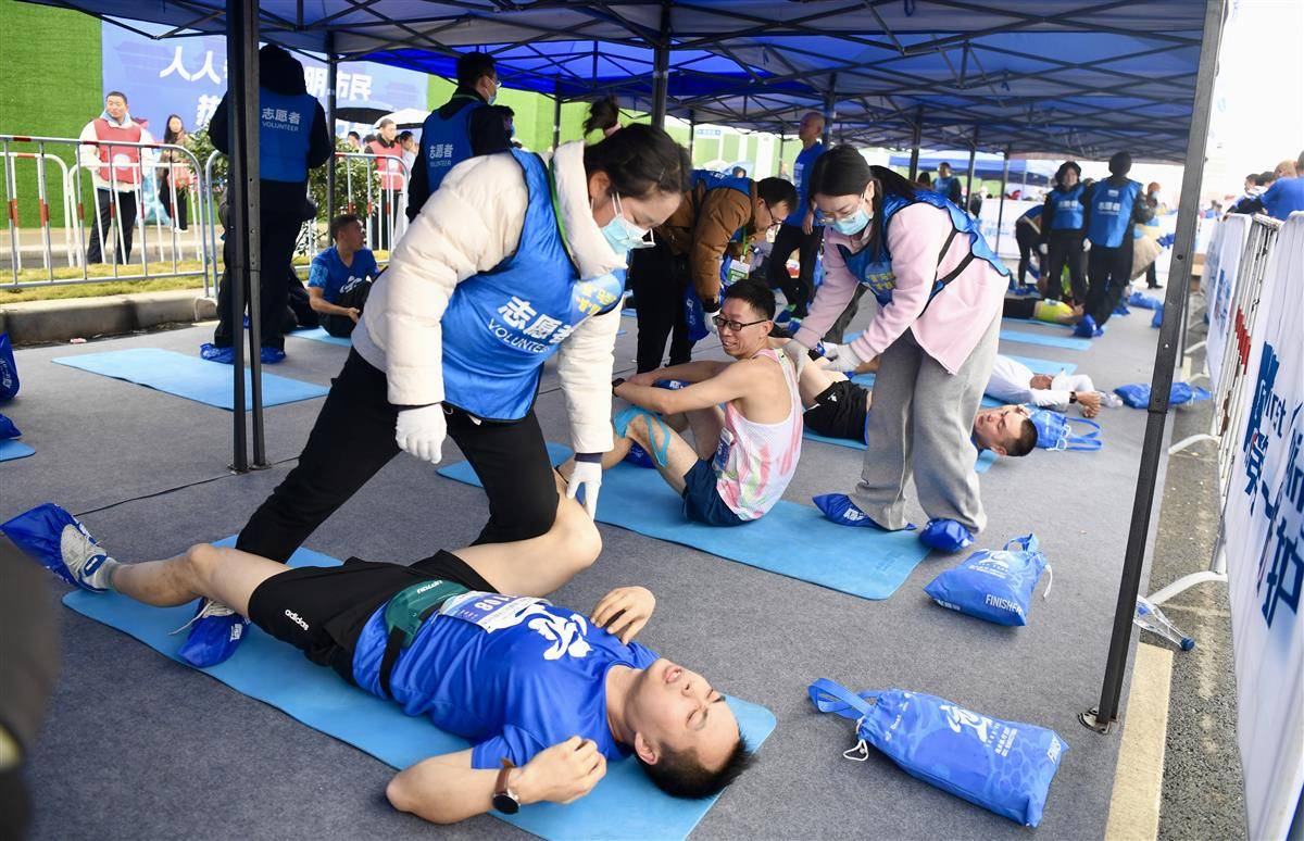 “放轻松,深呼吸。”随着越来越多的跑友完赛,宜城市人民医院的医疗保障团队开始忙碌起来:有的协助选手进入医疗站进行观察;有的监测血压、吸氧、局部按摩;有的认真记录选手的伤情和治疗措施……医疗保障工作有条不紊地进行。